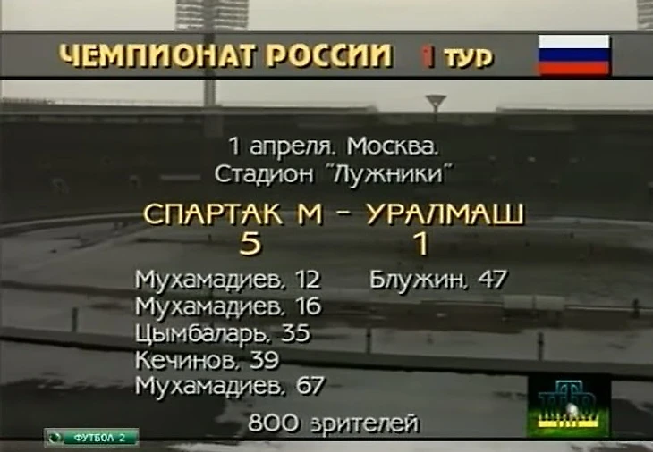 «Спартак» в ранге действующего чемпиона страны и надписью «Газпром» на груди разгромил «Уралмаш» – 5:1. Свидетелями хет-трика Мухсина Мухамадиева на покрытой белой пеленой поляне стала гигантская аудитория «Лужников» – 800 человек. Олегу Романцеву пришлось прятаться под крышей скамейки запасных, дабы непрекращающийся снег не затушил сигарету.