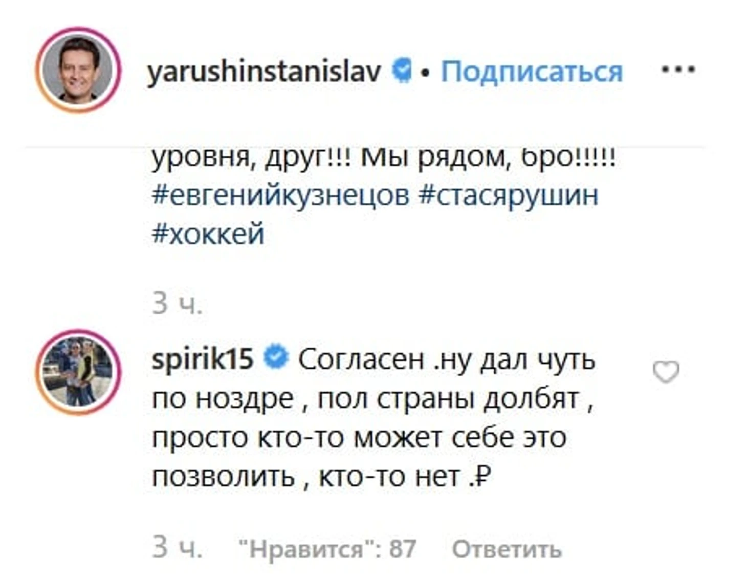 Спиридонов ответил на пост в инстаграме актера Станислава Ярушина, который призвал не судить хоккеиста за ошибки, а поддержать его в трудной ситуации.
