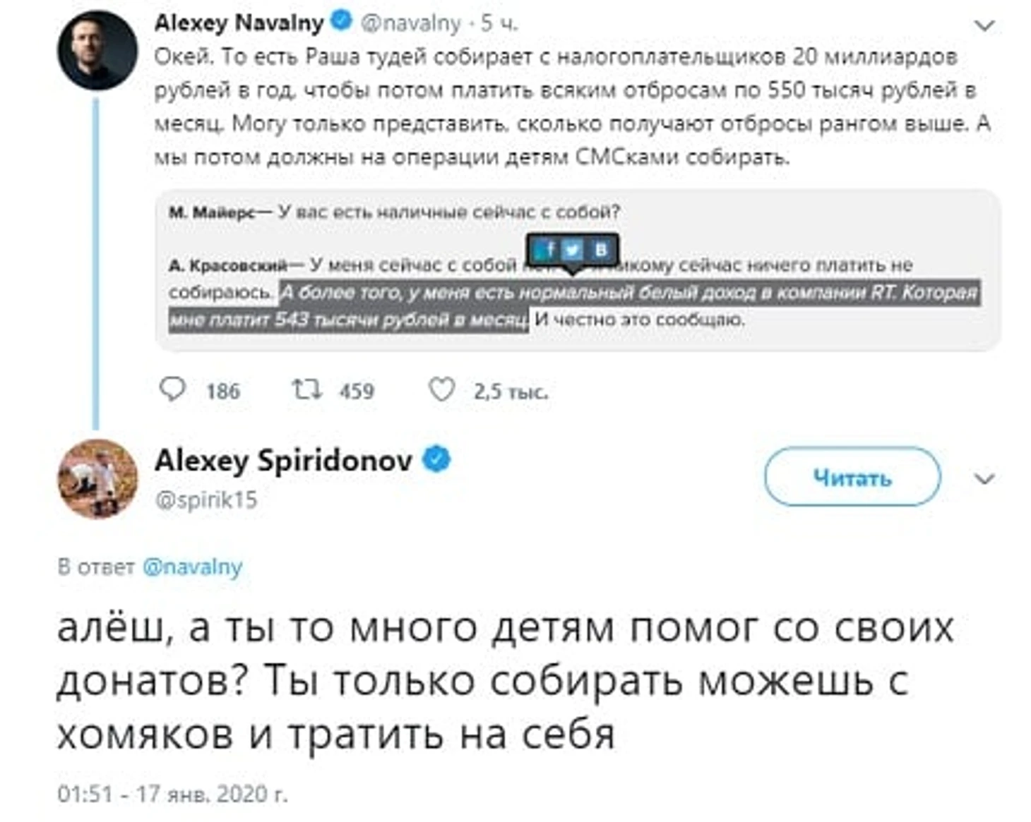 Спиридонов – Навальному: «Ты много детям с донатов помог? Только собирать можешь с хомяков и тратить на себя»