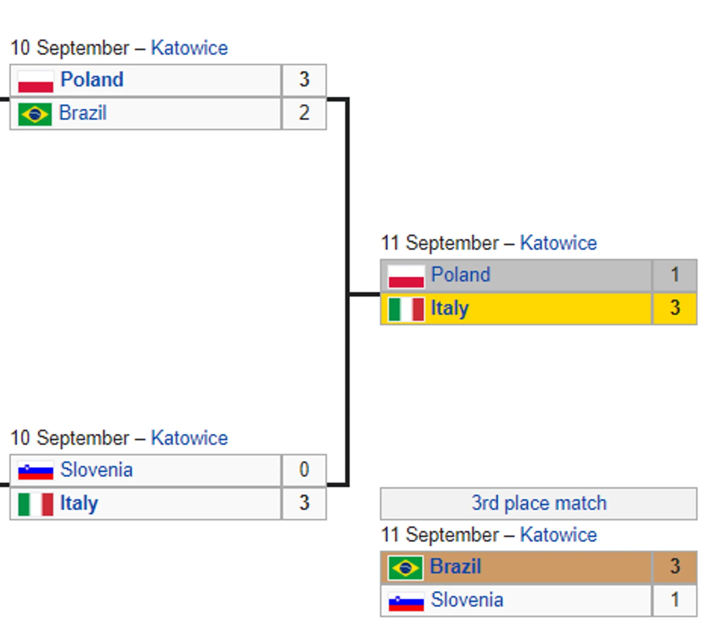 Полуфинал прошел 10 сентября в Катовице (Польша), а финал и матч за третье место – 11 сентября в том же городе.