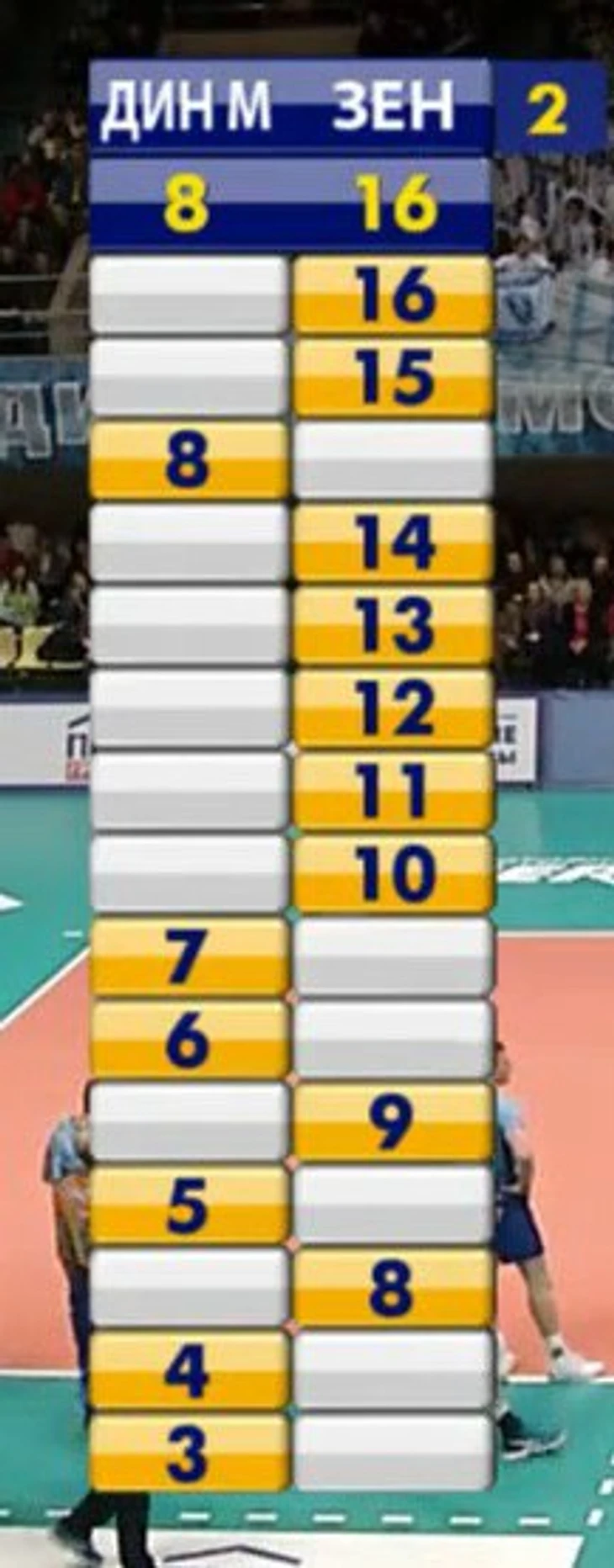 При счёте 20:17 в пользу "Зенита", Юрий Маричев решает обострить игру "динамовцев» и делает двойную замену: Маркина меняет Сергей Антипкин, а вместо Гранкина выходит Павел Круглов. После такой замены у "Динамо" на площадке оказывается два диагональных, а Антипкин сразу же идёт подавать. Сергей подаёт на отлично - Алексей Вербов еле-еле поднимает этот мяч, однако "Зенит" остаётся без атаки, за что тут же оказывается наказан встречной атакой Юрия Бережко.