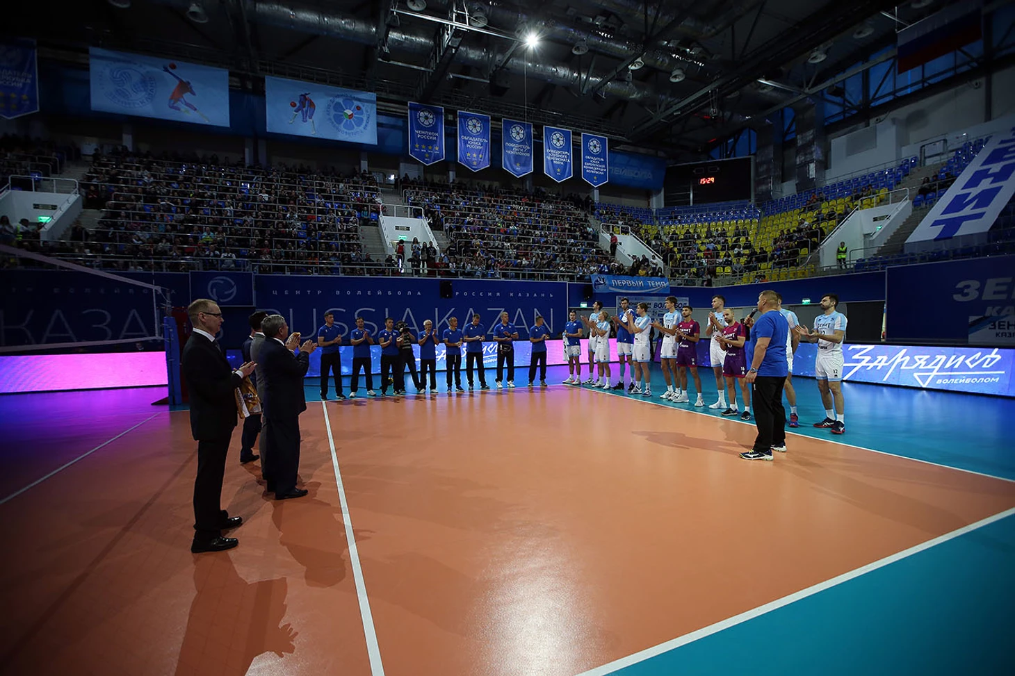 Волейболистов и публику поприветствовали президент «Зенита» Рафкат Кантюков и министр спорта Татарстана Владимир Леонов.