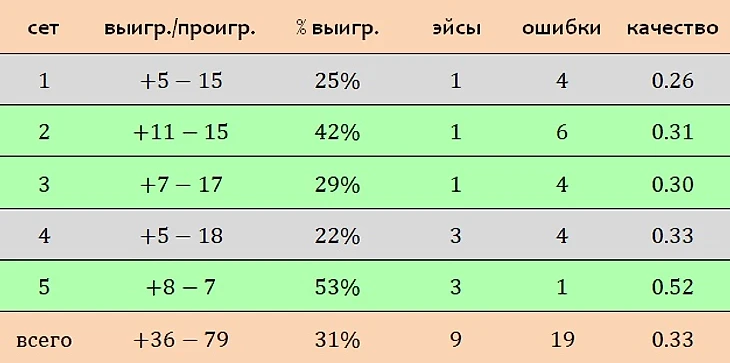 Статистика розыгрышей на подаче сборной России по сетам (зелёненькое - выигранные партии, серенькое - проигранные):