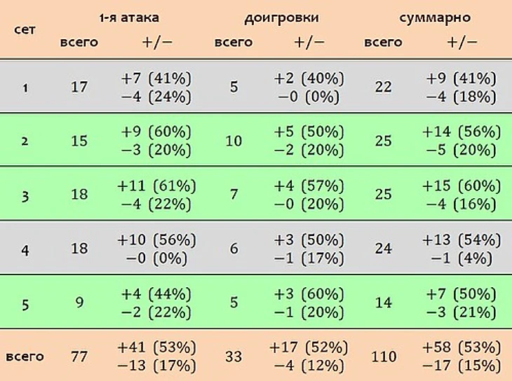 Что тут можно сказать? Самое интересное: наша сборная атакует в доигровках не хуже, чем с приёма (вообще с приёма показатели низковаты). Против японцев было то же самое. Ну и в очередной лохматый раз: четвёртая партия аномальна, не должна была она проигрываться с показателем "+12" на своих атаках (в выигранных партиях было и то хуже).
