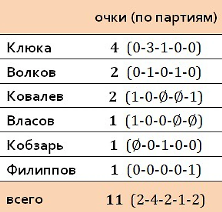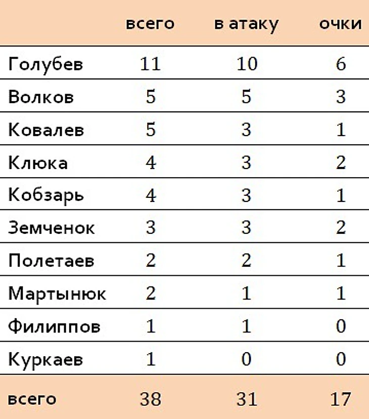 Лидеры по количеству атак по партиям: 1-я - Полетаев (9), 2-я - Клюка и Куркаев (по 5), 3-я - Клюка и Волков (по 7), 4-я - Земченок (8), 5-я - Куркаев (5). Глядя на эти циферки, можно предположить, что в 4-й партии Кобзарь несколько затупил с Земченком: тот не мог забить, а Кобзарь ему всё пасовал и пасовал.