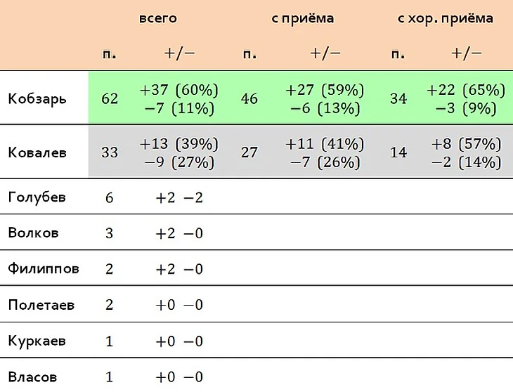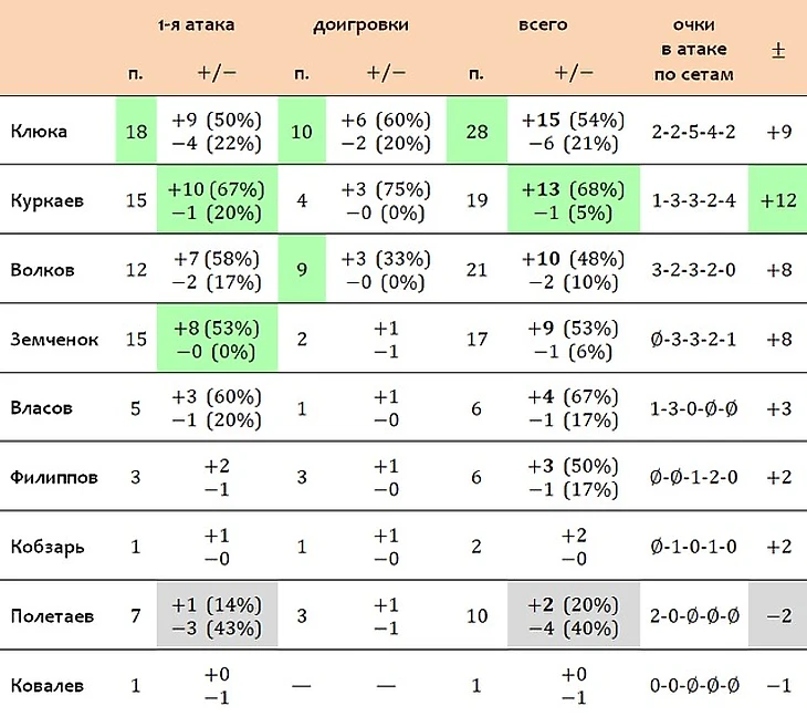 Очевидными героями матча выглядели Клюка и Филиппов с их подачами; при взгляде на статистику атак выявляется ещё и Куркаев с лучшим в команде "плюс-минусом"; а раз высокие показатели в атаке имеет нападающий первого темпа, то и пасующий молодец - в данном случае это Кобзарь, но о нём речь впереди. У Полетаева было всё грустно, но хорошо, что Земченок смог стать усиливающей заменой и показал надёжность. Правда, у Земченка был тяжёлый сет (в табличке это не отражено) - тот самый аномальный четвёртый, в котором из 8 атак Денис выиграл только две и проиграл одну. Основной вклад Земченка был во 2-3 партиях: +6-0 из 7 атак.