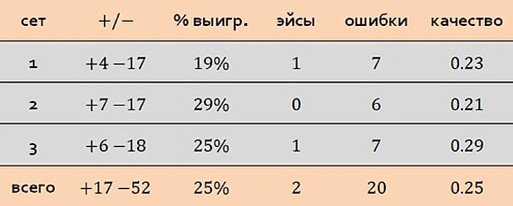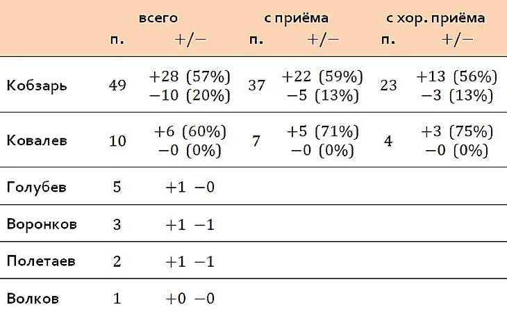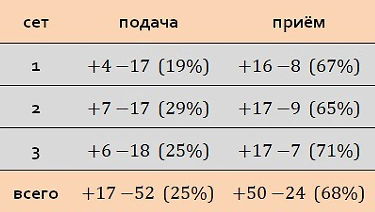 Цифры выигранных и проигранных сборной России розыгрышей на своей подаче и в приёме: