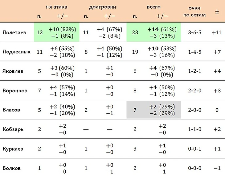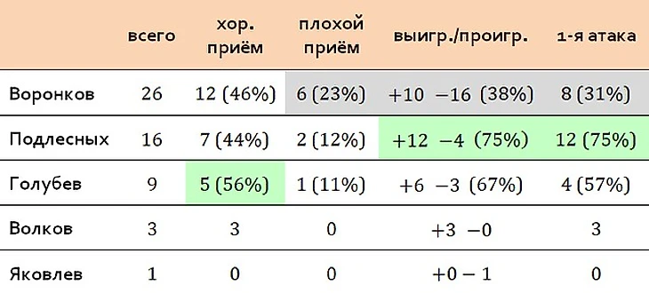 Получилось смешно: больше всех очков принесла подача Волкова, который играл только один сет. Конечно, слишком всерьёз эти циферки не надо воспринимать: здесь есть значительный элемент случайности, выборка очень мала, но ясно, что если в Питере будет играть тот же Волков, то его подача должна принести пользу. О Клюке я уж не говорю. В отчетном матче совсем не получилась подача у Феди, но у него это первая игра за сборную в старте: будет ещё. Меня порадовал Ваня Яковлев: по полезности он оказался не хуже Подлесных, а две его ошибочные подачи упали в очень близком ауте. Парень старается, хоть и молодожён.
