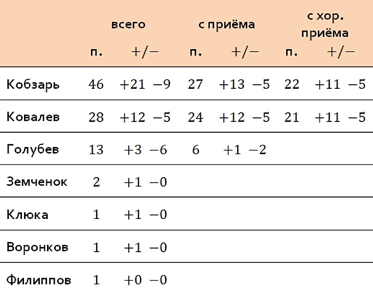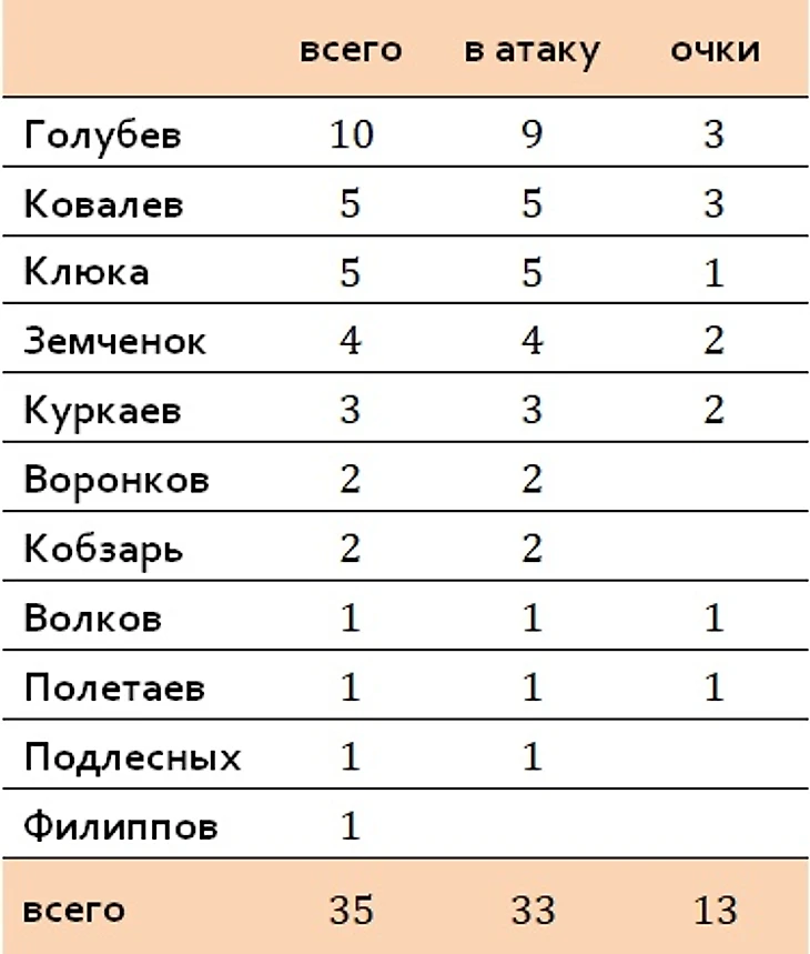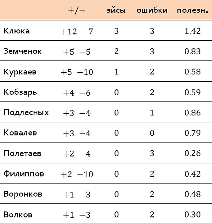 Полетаев, Волков, да и Филиппов в аутсайдерах — непривычная картина. Зато Клюка в точности повторил рекорд (+12-7) Кобзаря из матча против итальянцев.