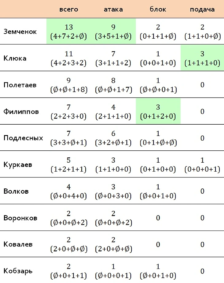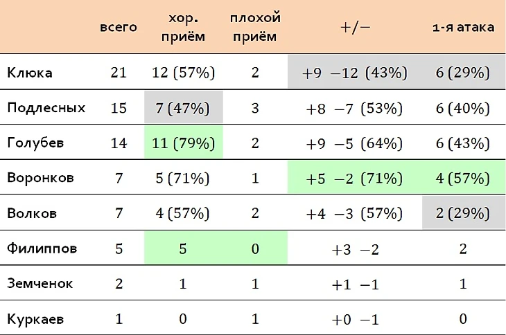 В отчёте о прошлом матче я заметил, что 4 приёма Клюки за 4 партии — это скорее норма центра, ответственного за укороченные подачи. И вот пожалуйста: Филиппов принимает 5 раз за матч, и всё безупречно.