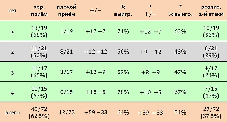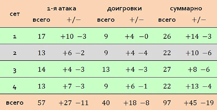 Я постепенно изгоняю из своих отчётиков процентные показатели. Кое-где они уместны, совсем от них не избавишься, но уж применительно к атаке "процент" — это весьма бестолковая характеристика. Правильнее смотреть на показатель "плюс-минус" и общее число атак. Например, в первой партии сборная России набрала "+11" в 26 атаках — это хорошо, а в третьей "+2" в 27 атаках — это катастрофично. Хорошо, что помогли канадцы: в той партии они сами сделали 6 ошибок в организации атаки (ауты, заступы, ошибки на второй передаче и т. д.).