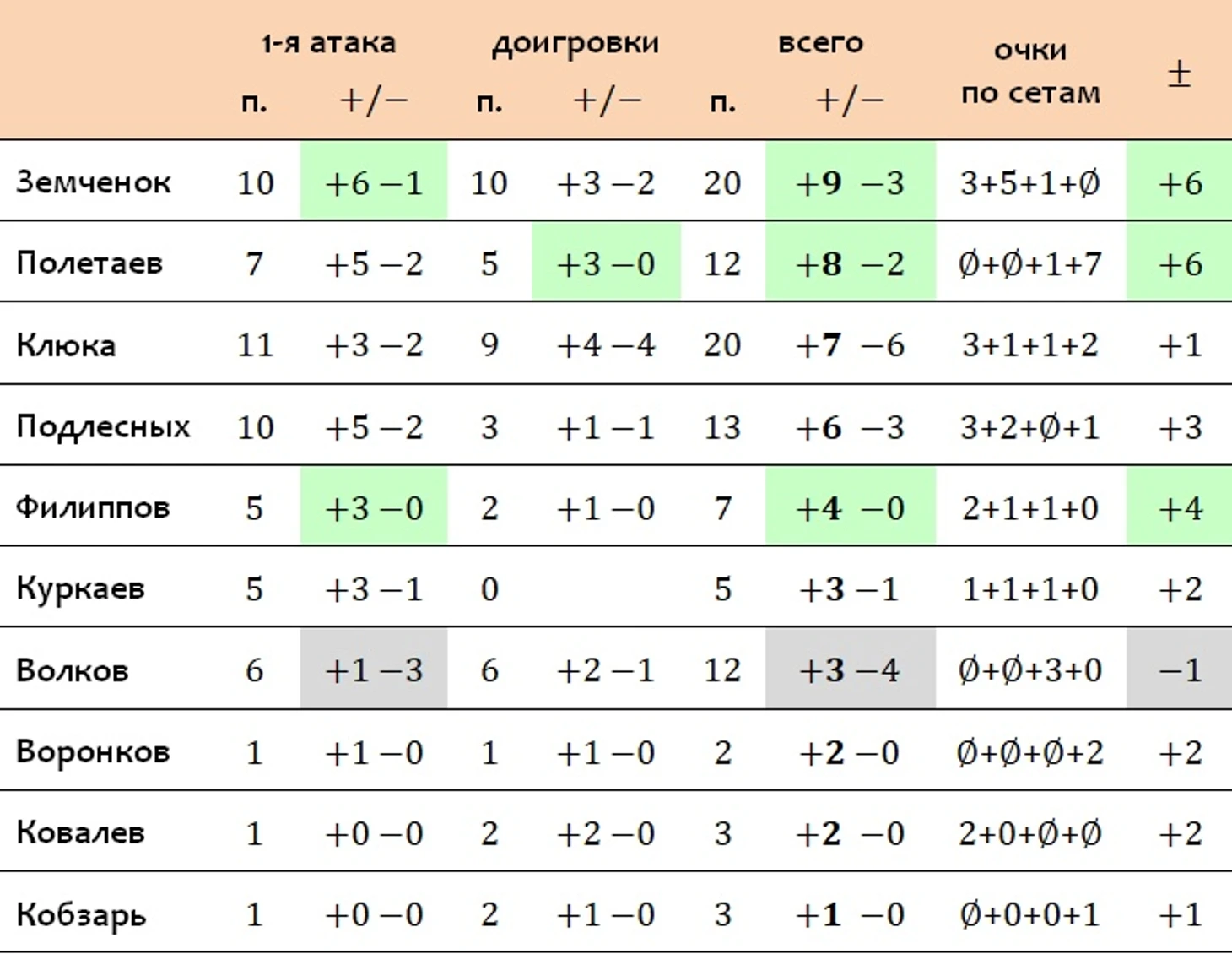 Отметим скромные (в абсолютном выражении) цифры центров. Основной атакующей силой были диагональные. Замена Земченка на Полетаева была очевидной, потому что во 2-й партии Земченок имел +5-0 в 6 попытках, а в третьей +1-2 в 7 попытках, причём единственная успешная атака — это переходящий мяч. При таких показателях диагонального хорошо, если есть кем его заменить. Я было подумал, что падение эффективности Земченка связано с выходом Кобзаря, но нет: с передач Ковалева у Дениса было +3-1 в 6 попытках, а с передач Кобзаря он забил три первые атаки подряд, после чего завяз.