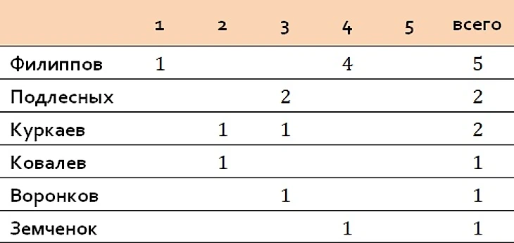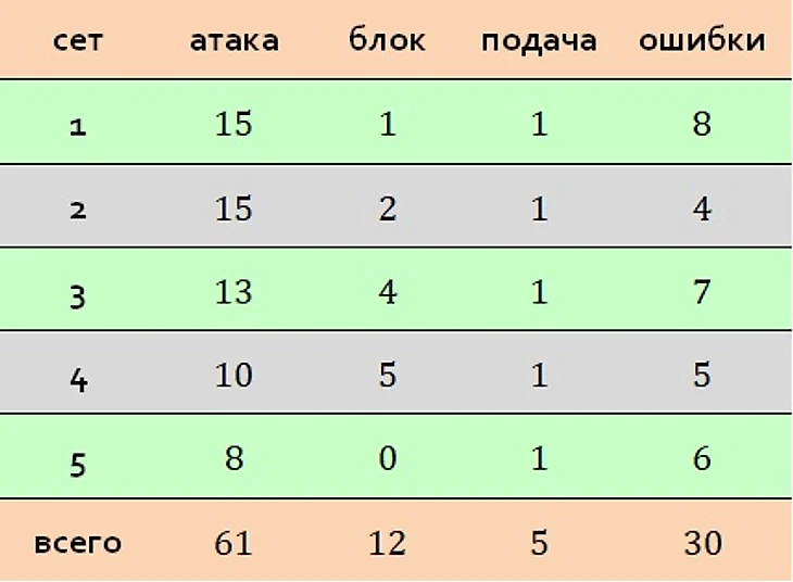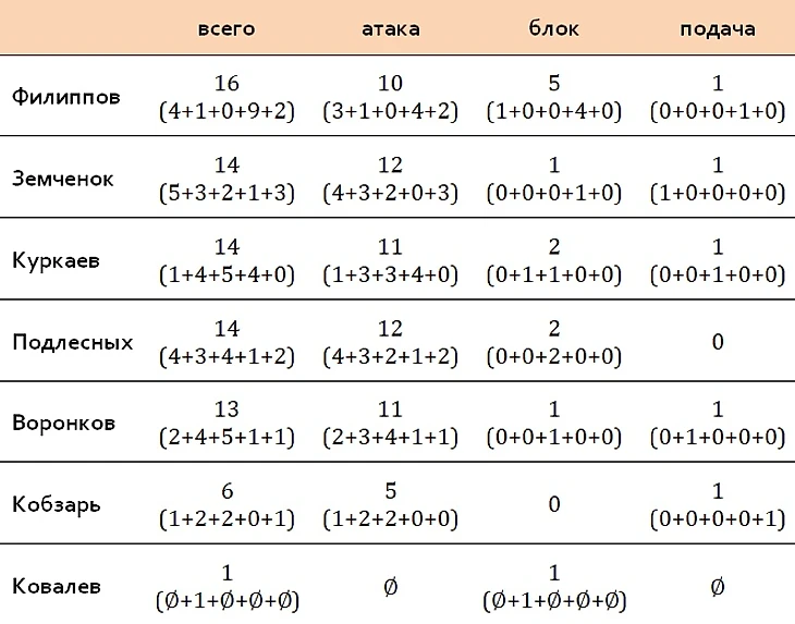 Можно заметить, что корреляции между работой блока и успехом в партии нет никакой. И прекрасные 4 блока Игоря Филиппова в 4-м сете, можно сказать, пропали втуне.