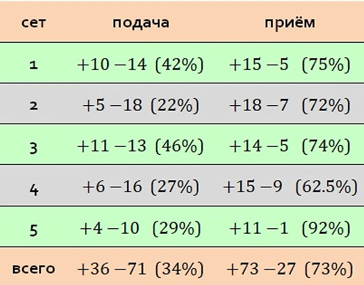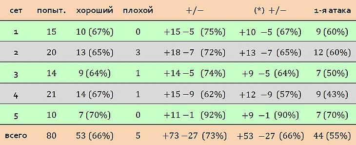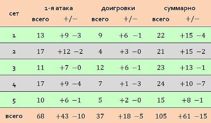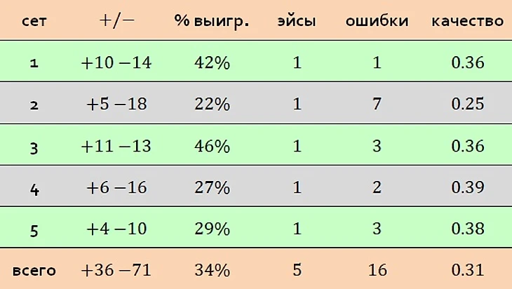 Атака у нас просела в 4-й партии, причем это скорее стечение обстоятельств (с приёма-то всё было не катастрофично, хоть и не замечательно). Но "плюс три" в атаке за сет — это проигранный сет.