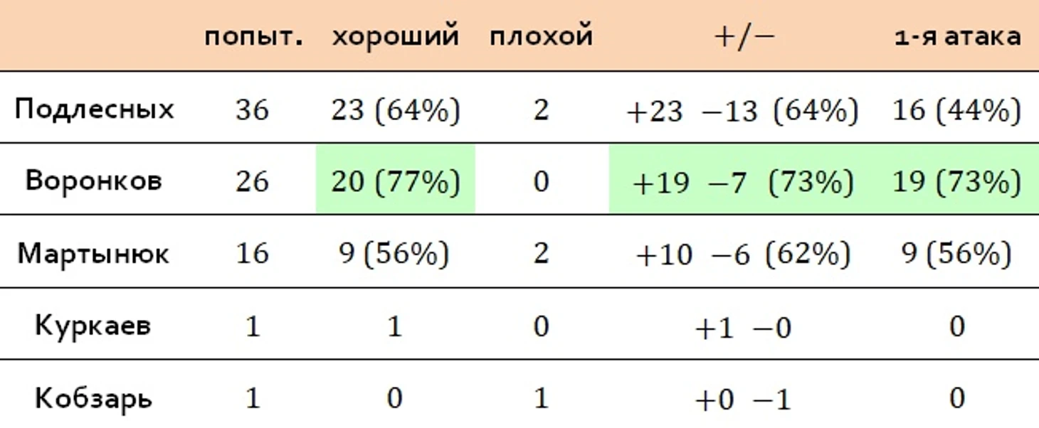В целом в этой игре Подлесных отнюдь не валился: посмотрите на его цифры атак с приёма. Воронков действительно мучался, но какая там доля его собственных тараканов, а какая - неудобные передачи, мне трудно оценить.