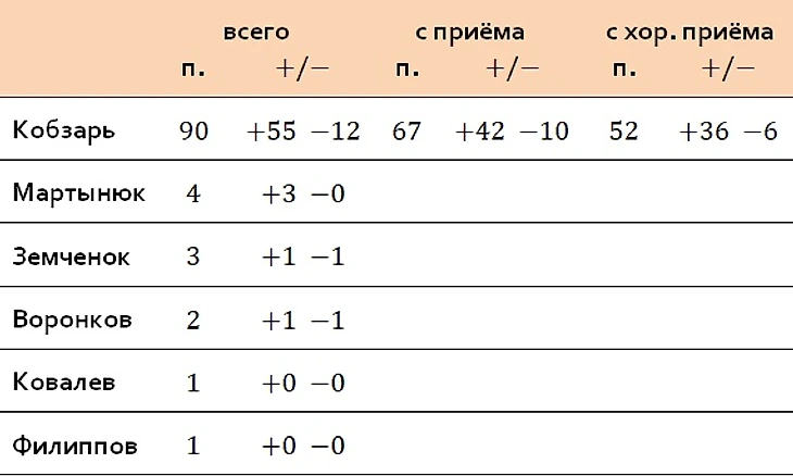 Федя хорош, либеро с худшими показателями приёма в команде — это нехорошо, а вот насчет Подлесных надо сказать особо. В целом его цифры в приёме смотрятся пристойно, но стоит заметить ещё, что он улучшал качество по ходу игры, и особенно это сказалось на тай-брейке, когда к Феде не прилетело ни одной подачи, а к Ярославу — 8, и он ни разу не ошибся, 6 раз довёл хорошо, и ещё 2 раза — приемлемо (по крайней мере не аварийно). С третьей по 5-ю партии у Подлесных 18/25 хороших приёмов, то есть 72%, и ни одной ошибки. Особенно приятно это смотрится на фоне предыдущей встречи.