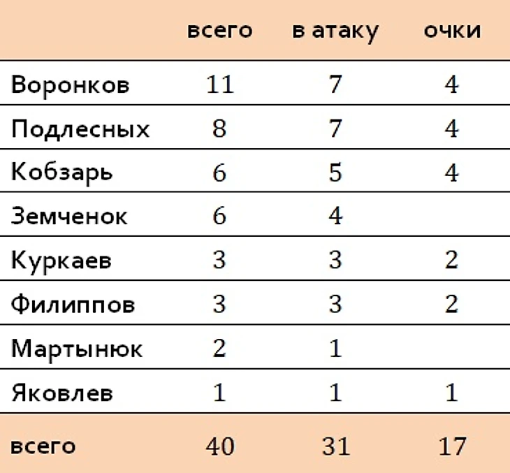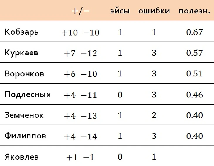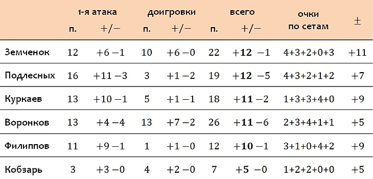 У Земченка я отнял одно очко по сравнению с официальной статистикой (там был розыгрыш, в котором Земченок не выиграл атаку, но блокирующий коснулся сетки — в официальной статистике такие очки записываются на счёт атакующего). Но в целом стоит отметить, что Денис очень мало проигрывает в атаке. Единственное проигранное очко — тот самый четвертый сет.