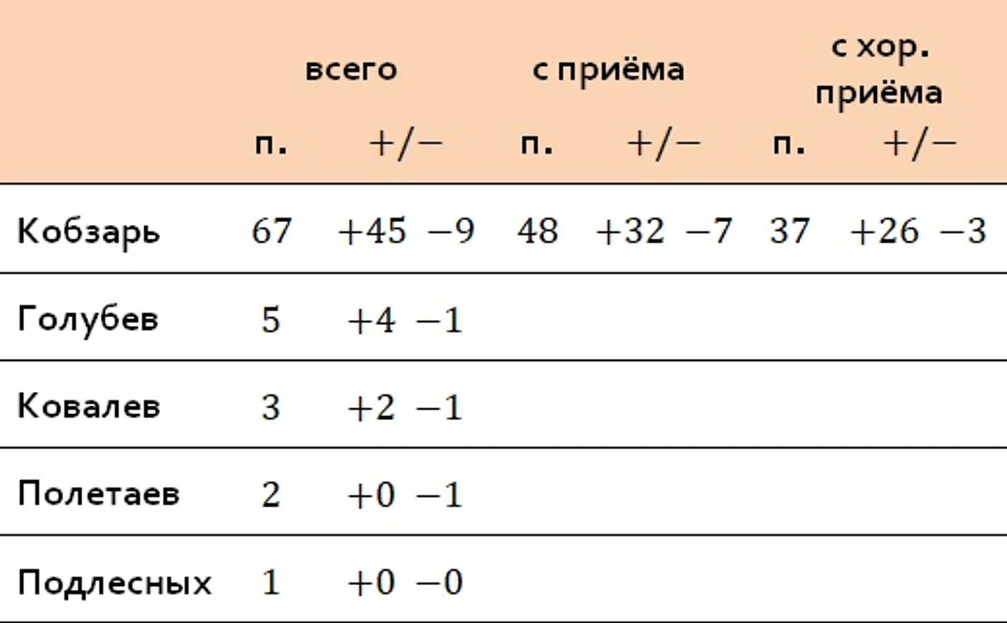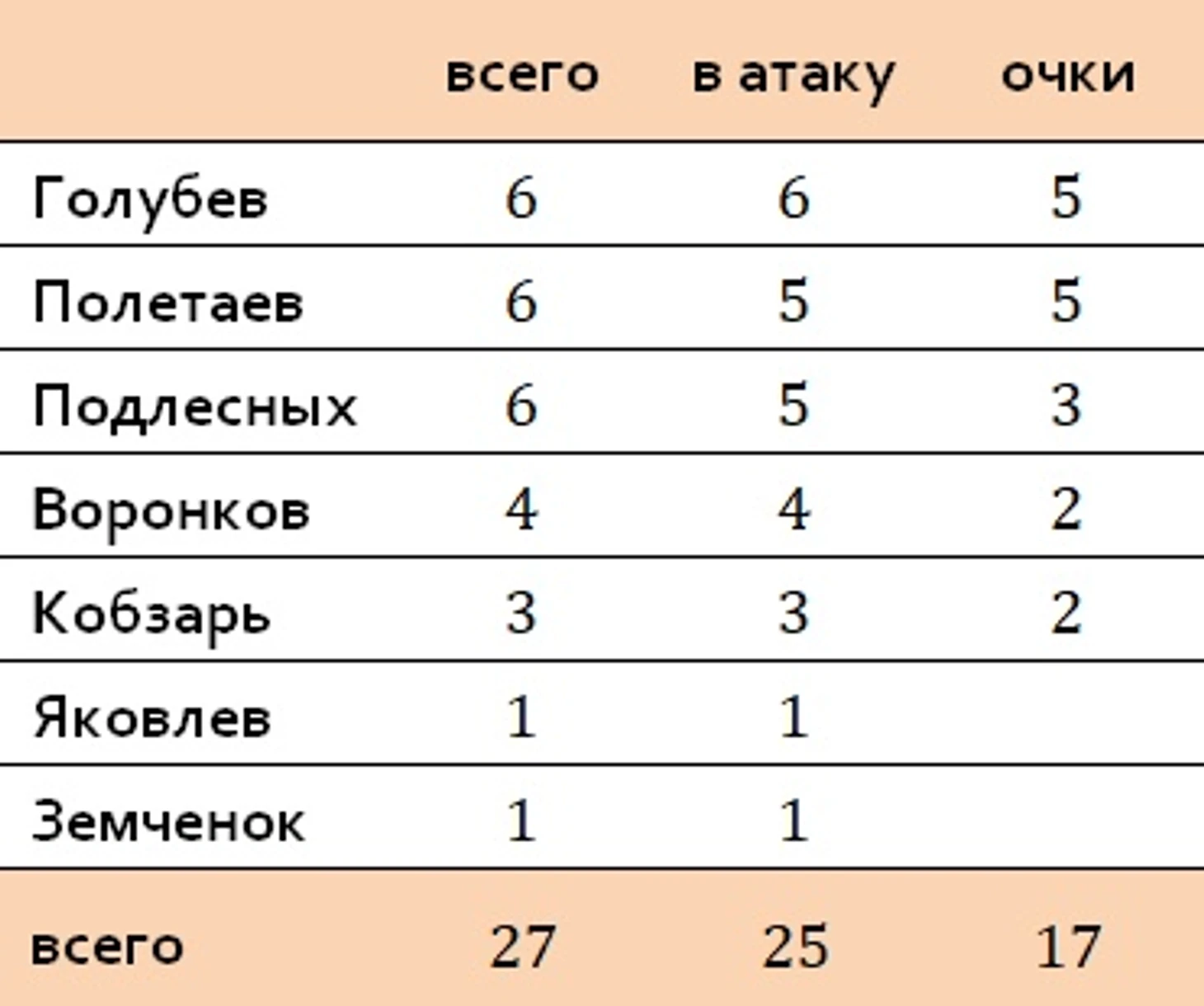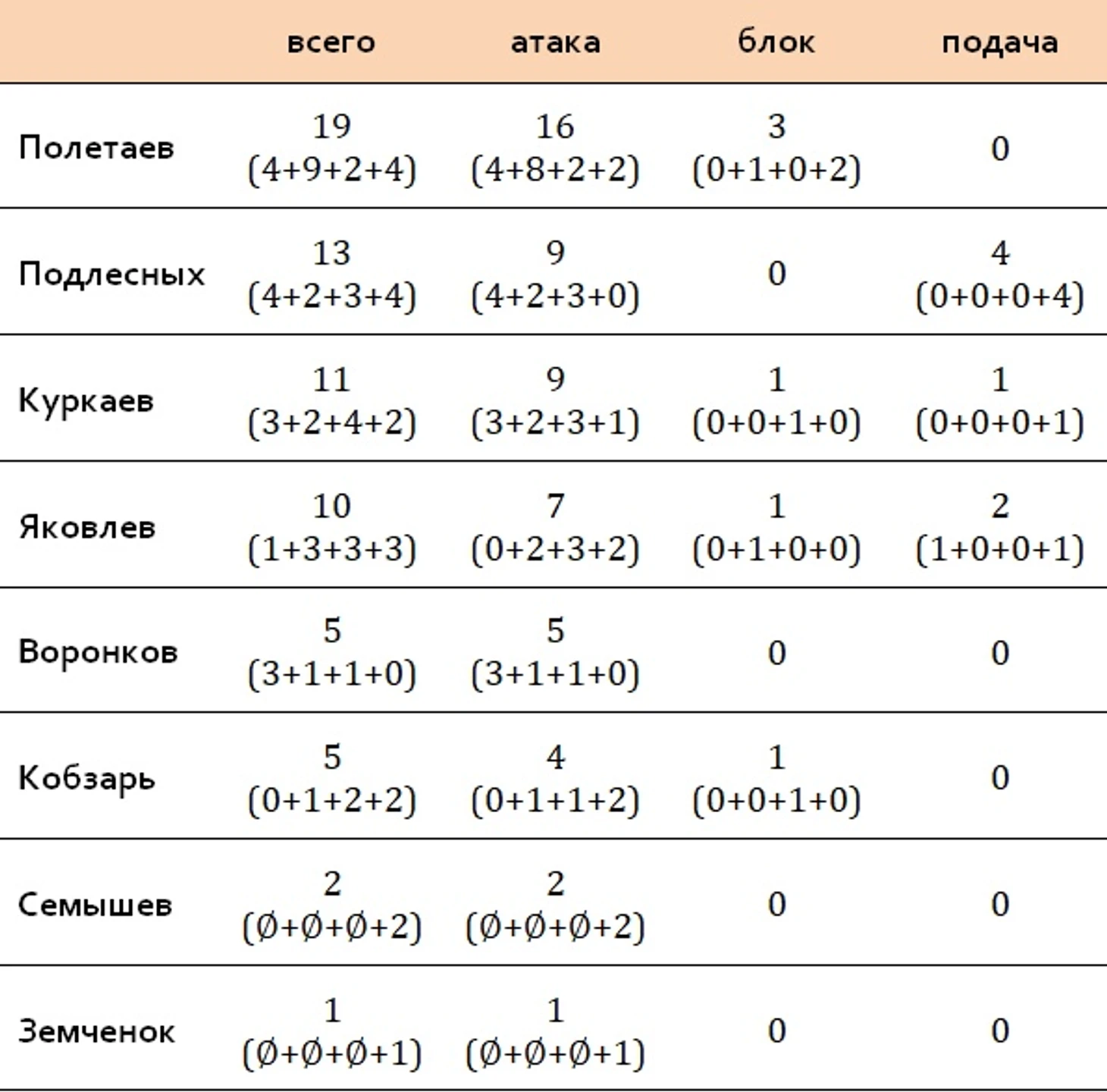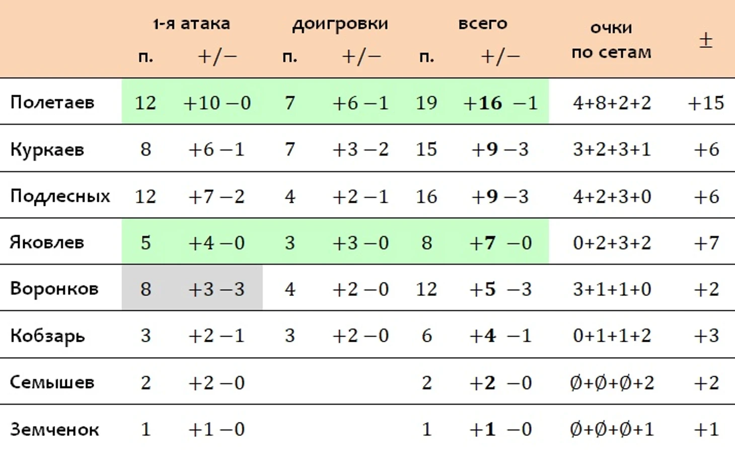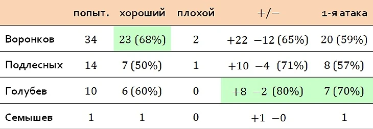 Единственный, кто мучался в атаке — это Федя. А Полетаев наконец добрался до лучших показателей в первой атаке. Во второй партии он выбил абсолютный результат — 8 атак из 8 (4 с приёма и 4 в доигровке). По официальной статистике у него даже 9 из 9, но в одном из случаев это было касание сетки блокирующим. Здесь кстати похвалим и Кобзаря, который после проигранной первой партии во второй загрузил лидера (те самые 8 передач на Полетаева), а потом, когда уже игра повернулась в нашу сторону, распределял передачи равномерно (в третьей партии по 5 передач на Подлесных и Куркаева, 4 на Полетаева, в четвертой — три передачи на Яковлева, по 2 получили Полетаев, Подлесных и даже Семышев, который и вышел-то в самом конце). Но вообще о передачах у нас сказано здесь: