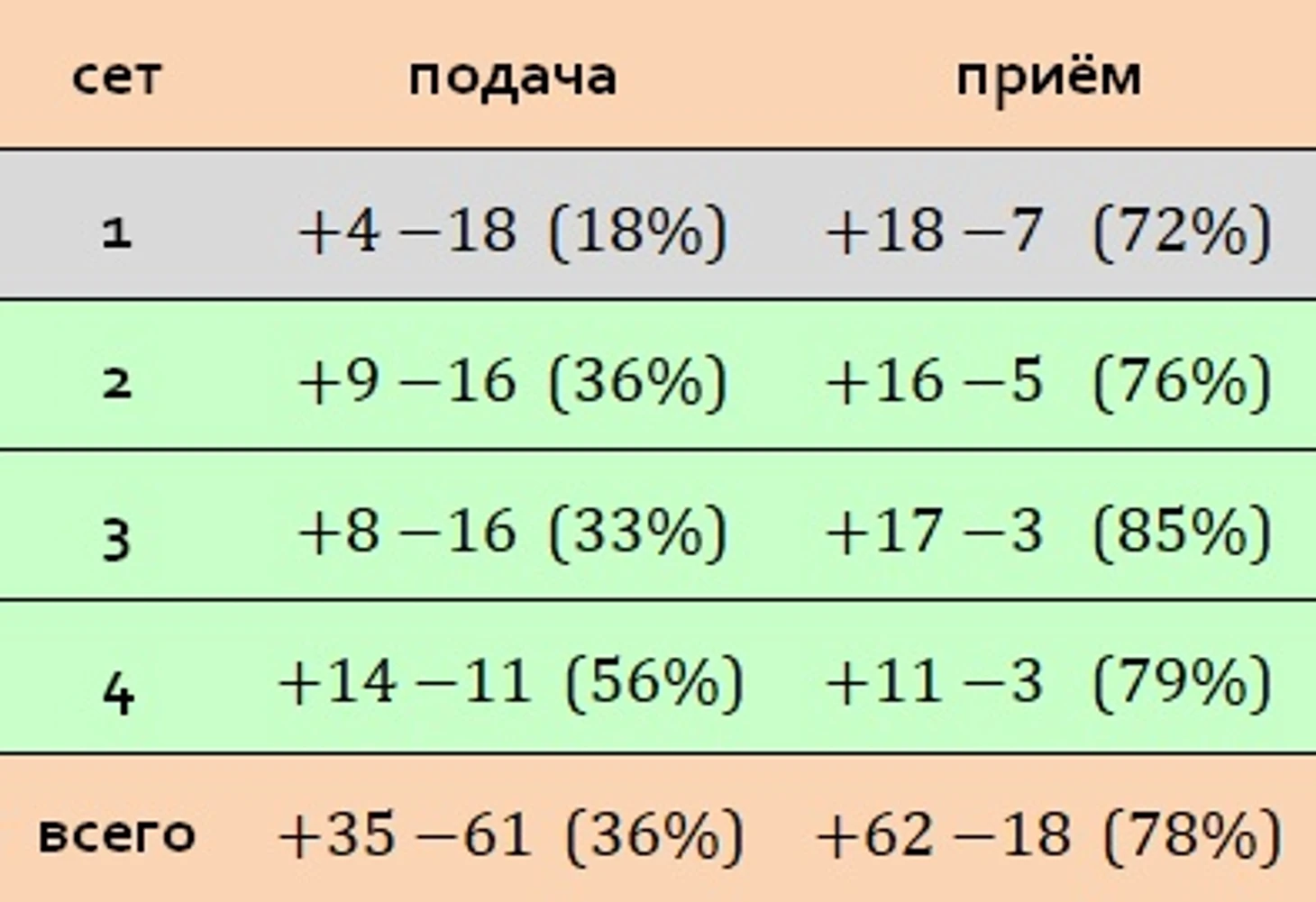 Всего 4 брейковых очка в первой партии — это совсем мало, но качество подачи в этой первой партии было не хуже, чем в следующих двух. Просто немцы в первом сете выжали из себя всё что могли в атаке — например, выиграли все три атаки со сбитого приёма. Но долго так продолжаться не могло, тем более что наши постепенно сокращали число ошибок (даже Полетаев перешёл на планер — очевидно, именно ради этого). В четвёртой партии немцы уже почти не сопротивлялись.