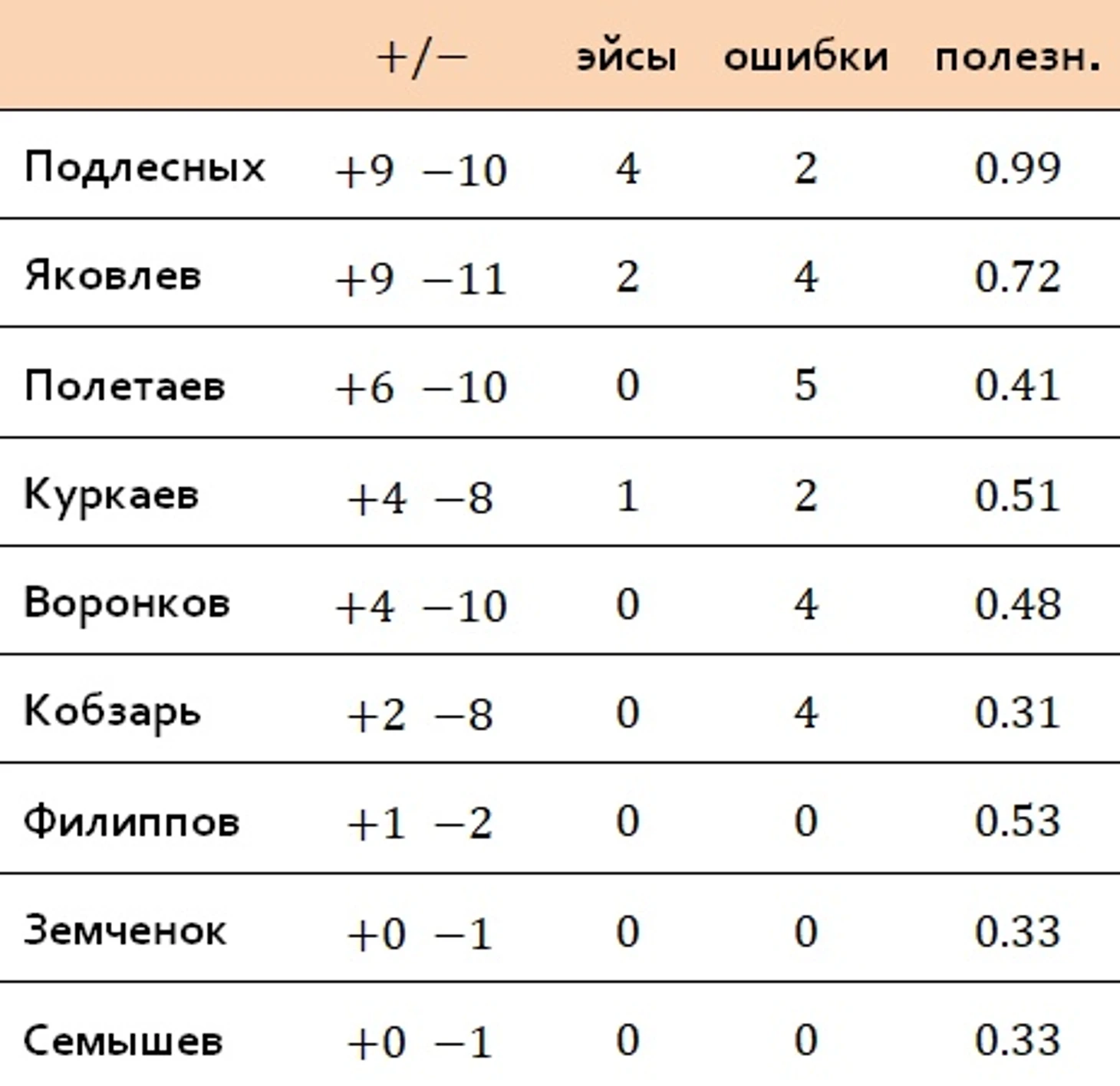 В этом матче запомнились, конечно, 4 эйса подряд Ярослава Подлесных — за счёт этого он и попал на вершину рейтинга. Но стоит заметить всё же, что эта серия случилась в 4-м сете, и когда Подлесных выходил на подачу, счёт уже был 14-9, то есть своими подачами он добивал уже сдавшегося соперника. Серия всё равно мощная (там было даже не 4, а 5 выигранных очков — перед четырьмя эйсами был один переходящий мяч), но ценность её гораздо ниже, чем у серии подач Полетаева в первом сете матча с Италией — тогда счёт из 12-16 превратился в 16-16, и во всём матче случился перелом. Когда я высказал эту мысль в ветке тура, меня минуснули. Очень характерно, как менялась полезность подачи Подлесных по партиям: в 1-й 0.24, во 2-й 0.38, в 3-й 1.13, в 4-й 2.89. У Вани Яковлева, чья подача принесла те же 9 брейковых очков, всё было гораздо ровнее, очки набирались в каждом сете (в частности, из 4 брейковых очков в первой партии два пришли на Ваниной подаче).