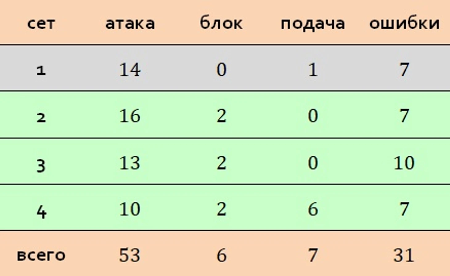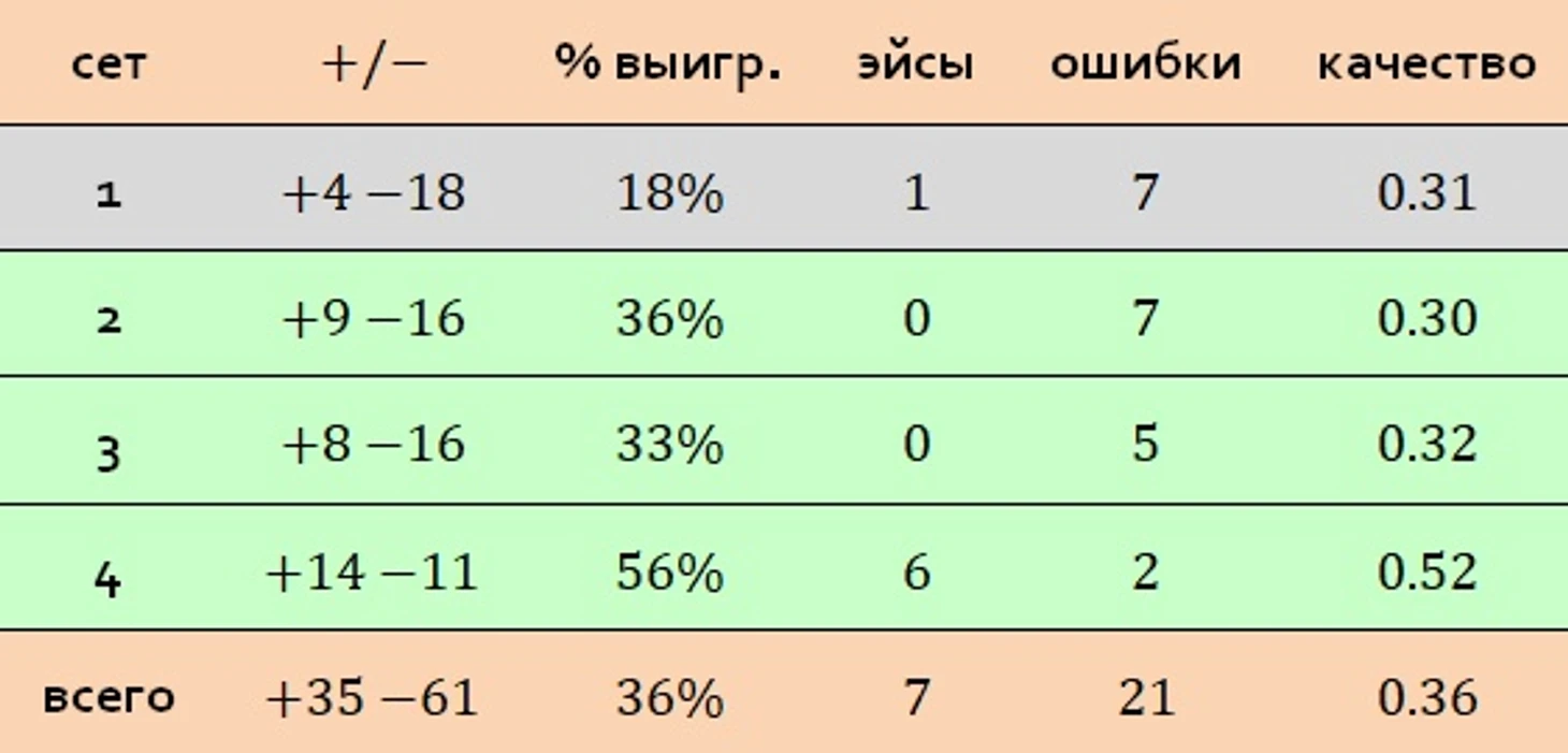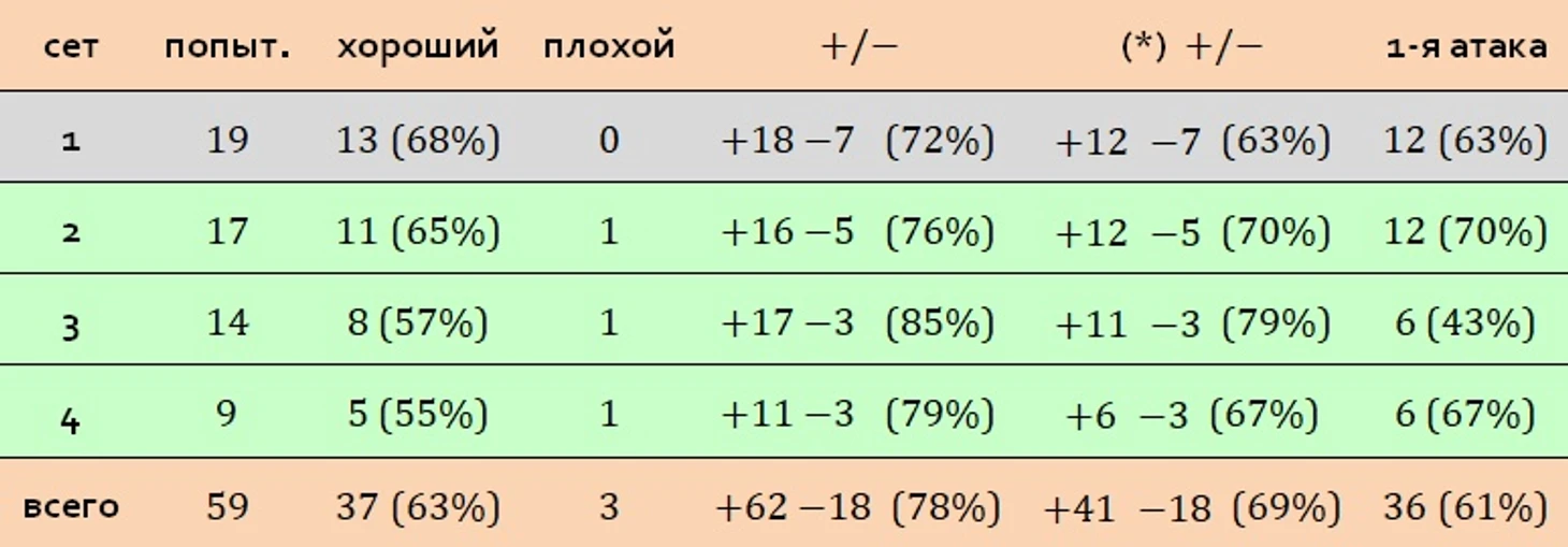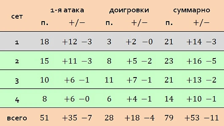 В атаке всё было хорошо и чистенько (очень мало атак проиграно) — лишний раз видно, что результат первого сета имеет скорее характер случайного выброса. Можно заметить, что мало доигровок было в первой партии. Она вообще была быстрая в том смысле, что большинство розыгрышей закончились в первой же атаке — и блок, и защита с обеих сторон работали мало.
