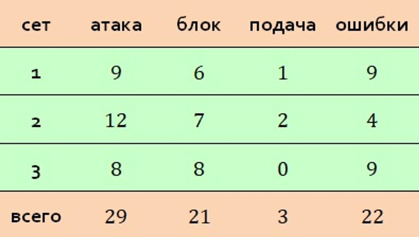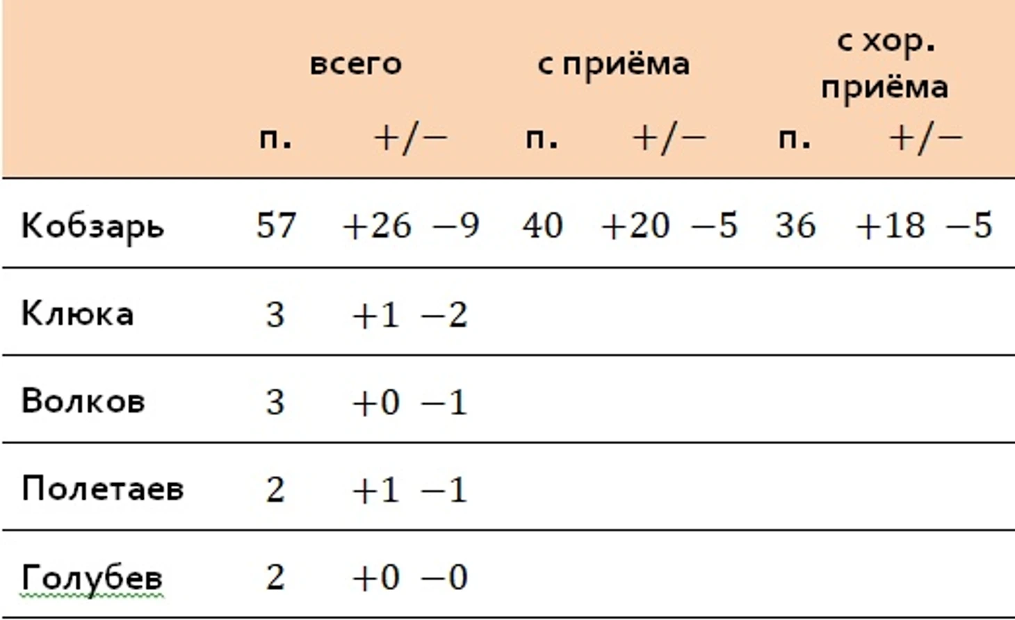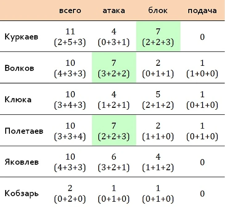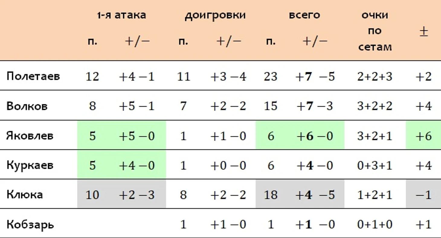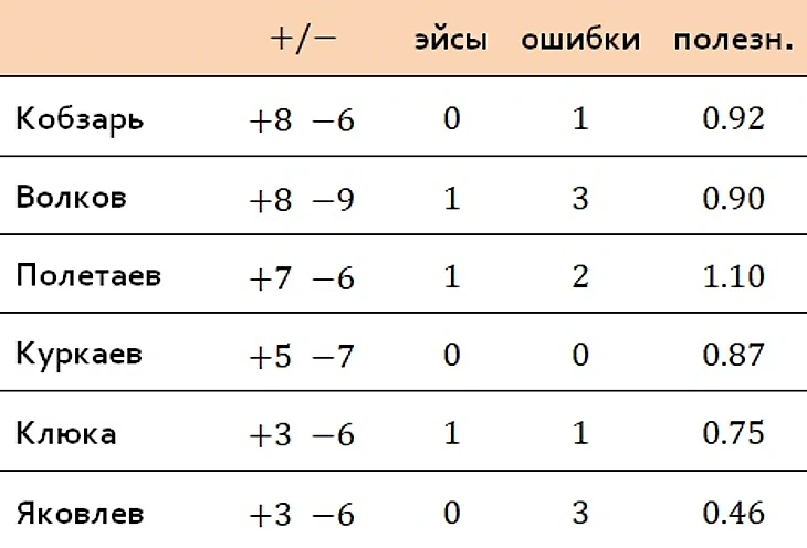 Муки краёв и блеск центральных — вот что мы здесь видим. Кстати, исходя из этого, Кобзарь мог бы и побольше пасовать центрам. Впрочем, в концовке второй партии (а это был единственный эпизод матча, когда действительно надо было дорожить каждым розыгрышем), он и дал две подряд передачи Куркаеву. Здесь как раз уместны циферки передач: