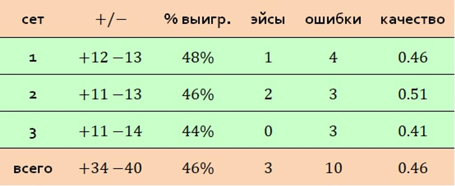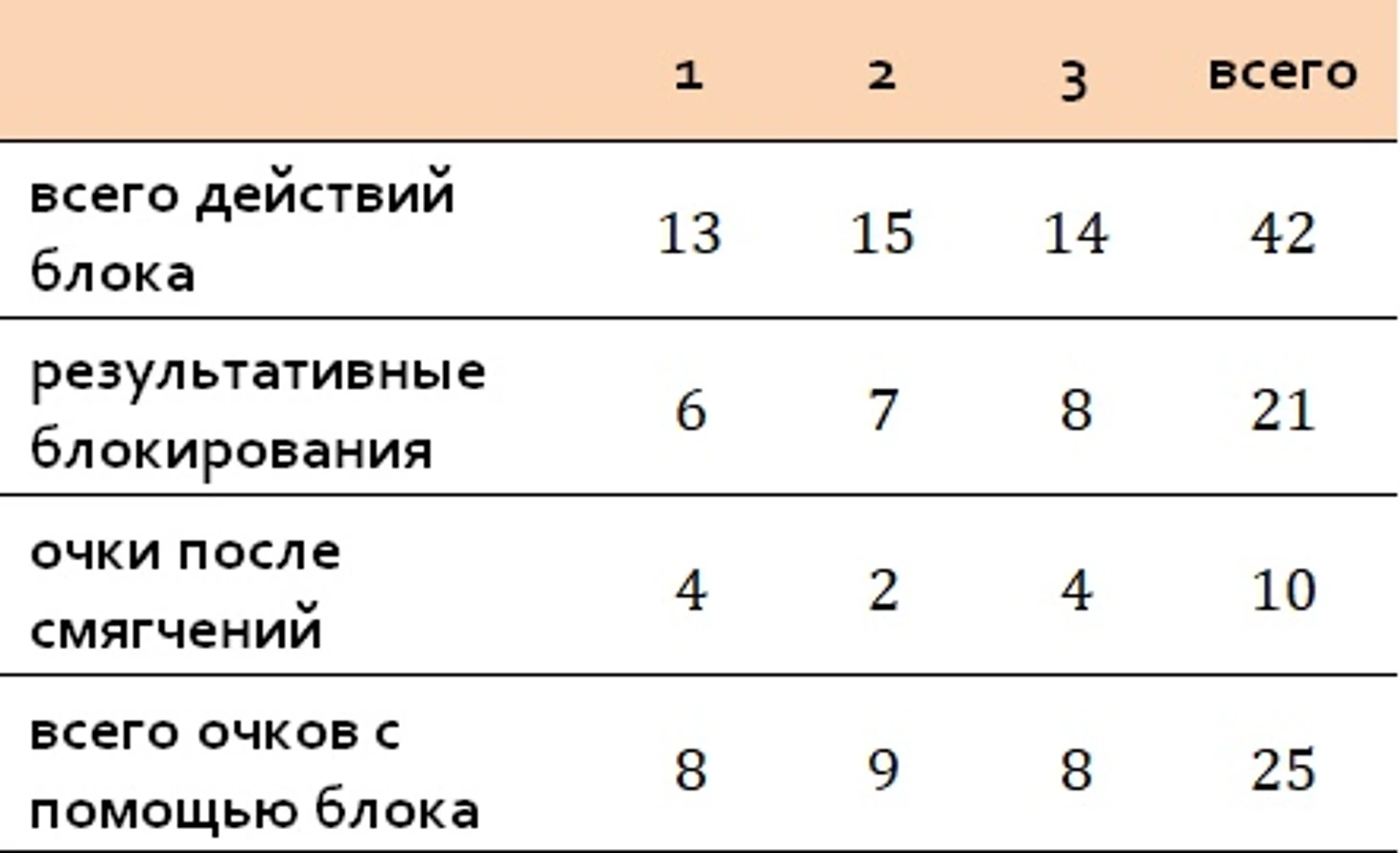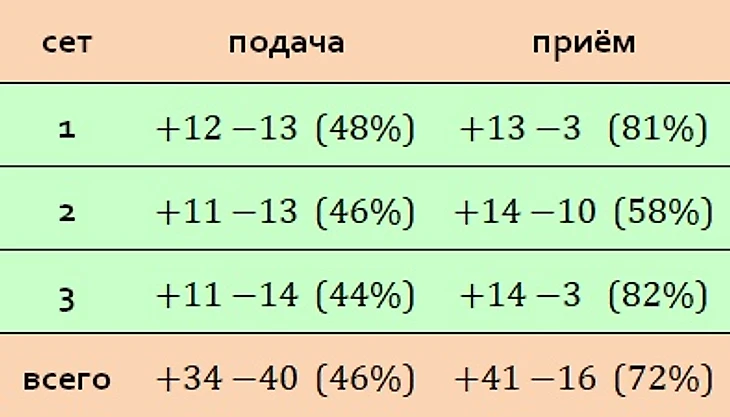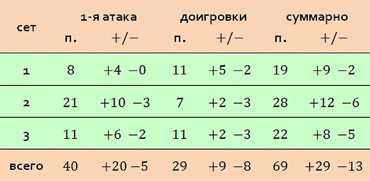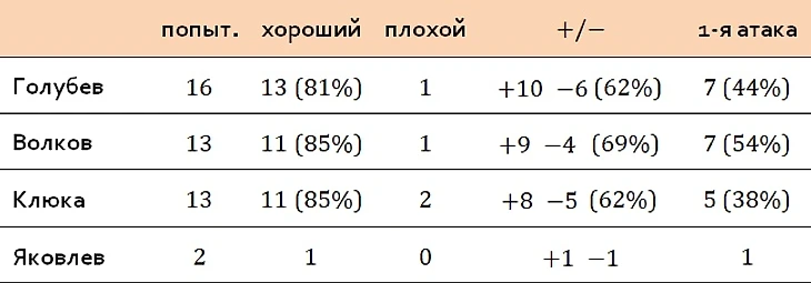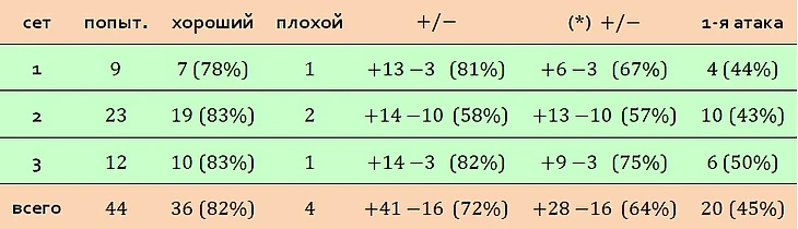В матчах предварительного этапа у нас нередко наблюдалась странная картина — показатели атаки в доигровке были выше, чем непосредственно с приёма. В этой игре пропорции больше похожи на нормальную команду, но КПД, конечно, фиговенький. К тому же эффективность атаки уменьшалась с каждой партией.