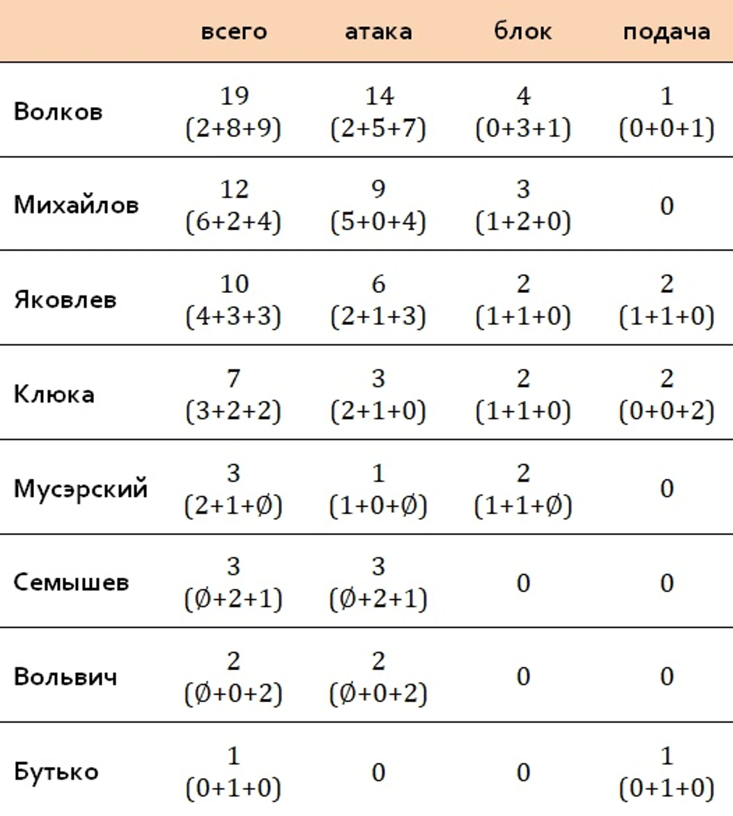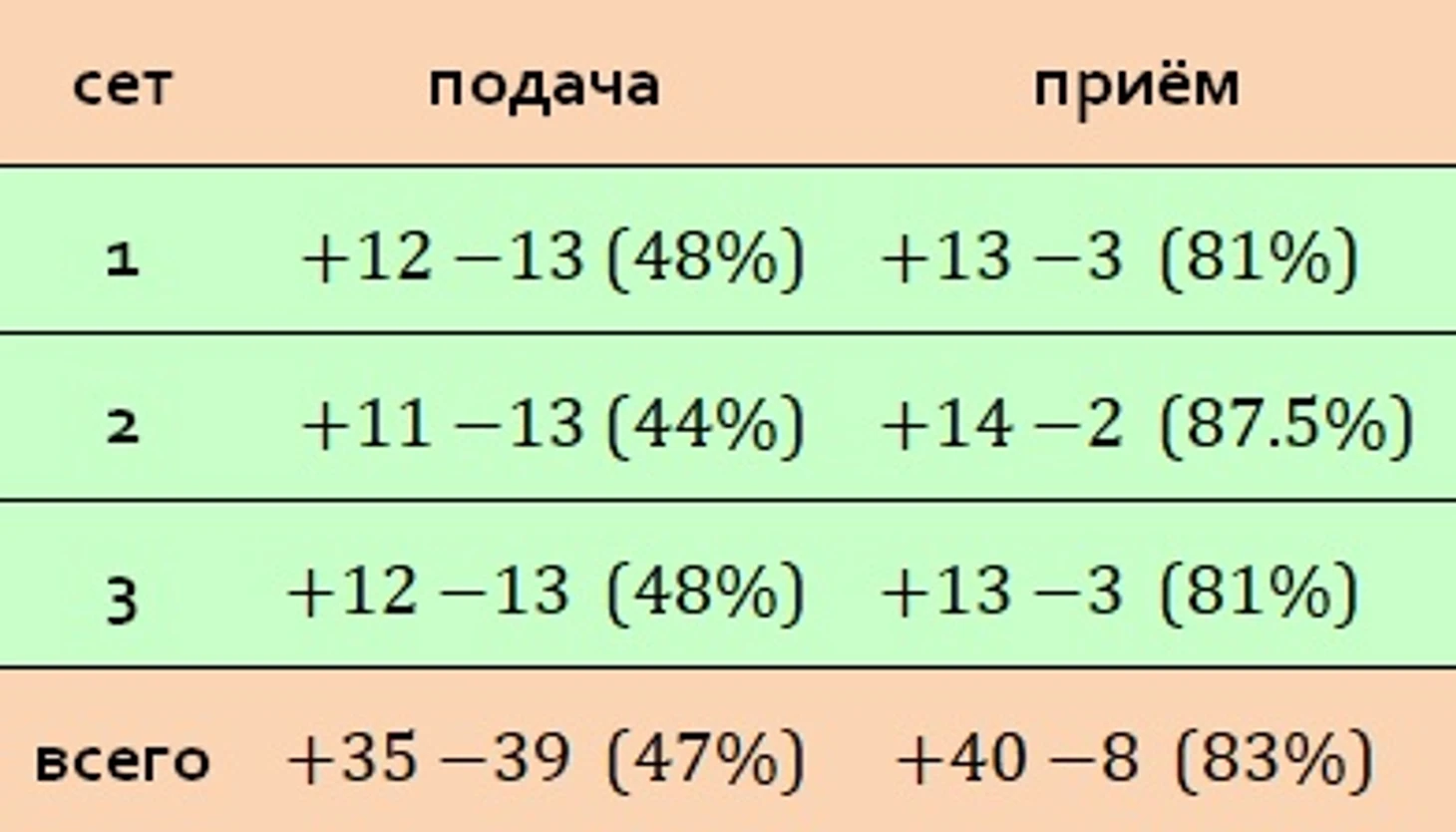 Любопытен (всё-таки нашлось интересное) перелом в цифрах третьей партии по сравнению со второй. Очевидно, греки, вкусив во втором сете сурового русского блока, перестали в атаке стучать в стену и предпочли минимизировать риск проиграть очко сразу: а это дало нам массу доигровочных атак. Ну и благодаря тому, что греки в третьей партии мало ошибались на подаче (всего 2 раза), у сборной России было много первых атак, и большинство из них наши реализовали.