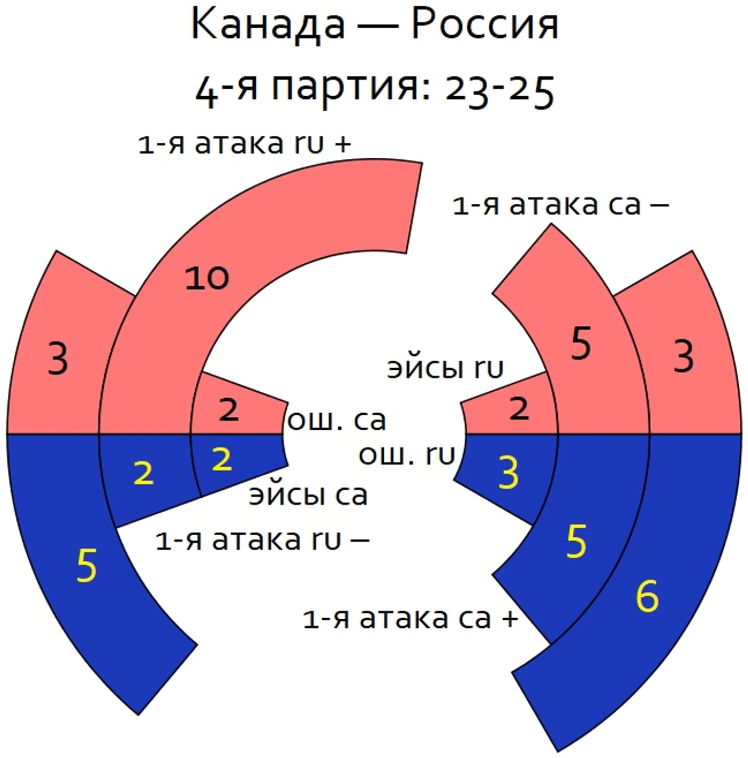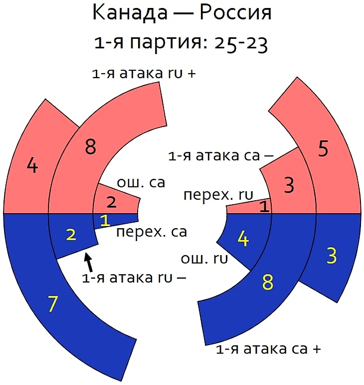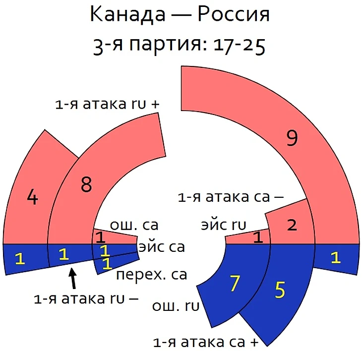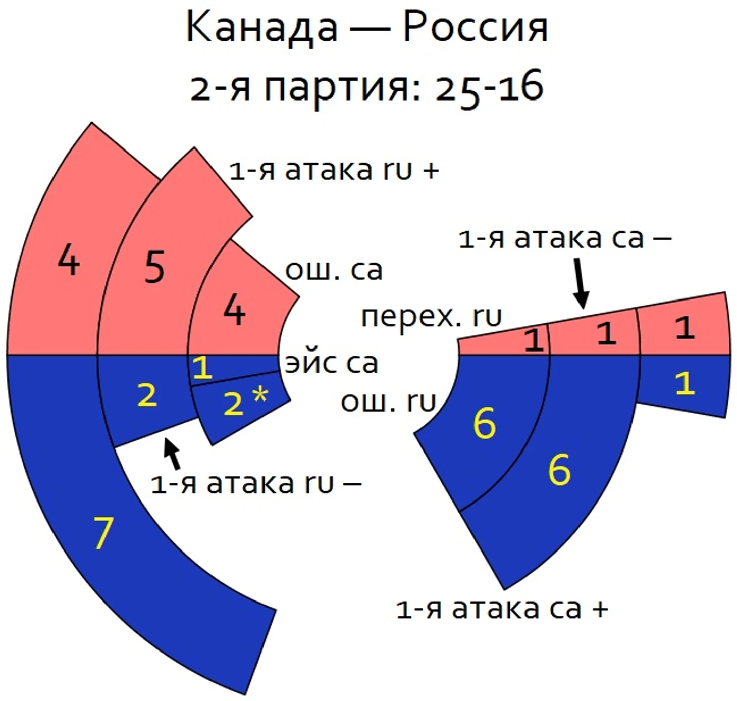 Наши отдали канадцам слишком много доигровок после своих незабитых атак — кажется, партия была проиграна именно в этом пункте. Ключевой момент — именно незабитые первые атаки. А два ключевых отрезка партии — в самом начале (1-1 → 1-6 — но после этого канадцев удалось-таки достать и даже выйти вперёд) и в самом конце (22-21 → 22-24): вот здесь-то два раза подряд наши не забили атаки после хорошей доводки и подарили канадцам контратаки.