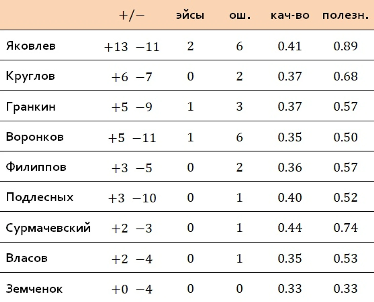 Многим запомнились ошибки Андреева в приёме, но конкретно в этом матче они (точнее, 3 из 4) сконцентрировались в третьей партии, а она для нашей команды оказалась совсем беспроблемной. В целом доводка Андреева была вроде бы не провальной, но итоговый результат плохой. Ваня Яковлев, как обычно, чётко отслеживает укороченные подачи, когда находится на передней линии. Это ещё одна польза команде от него.