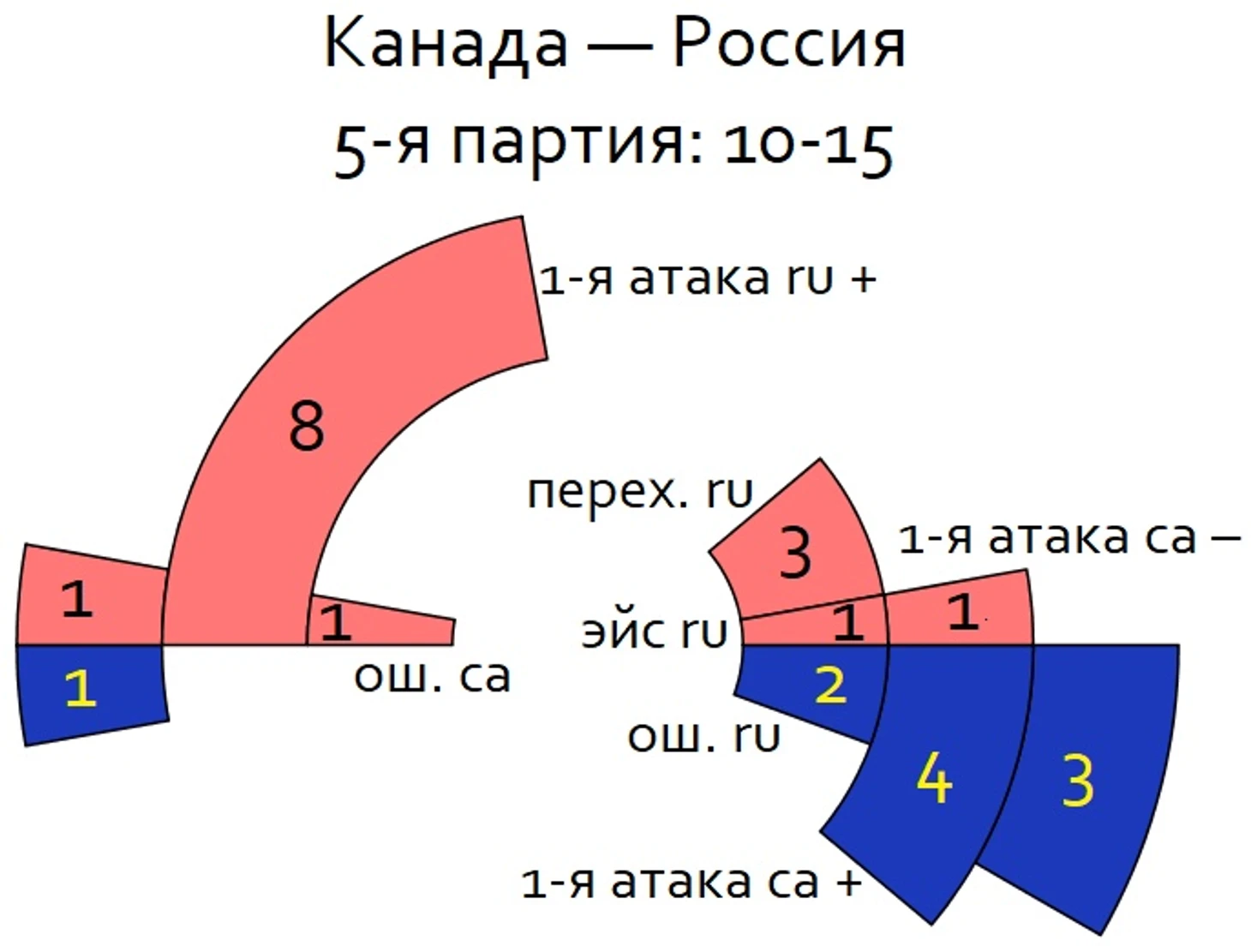Забавно, что третья-четвёртая партии оказались почти точным зеркальным отражением первой-второй. Эта картинка напоминает карточного короля или валета. А может, и даму. Первая партия слегка аномальна по российским меркам: выиграно много брейковых очков, но сет проигран. Дальше всё было логично, а пятый сет, как обычно, стоит особняком.