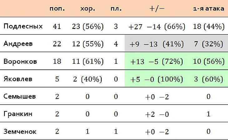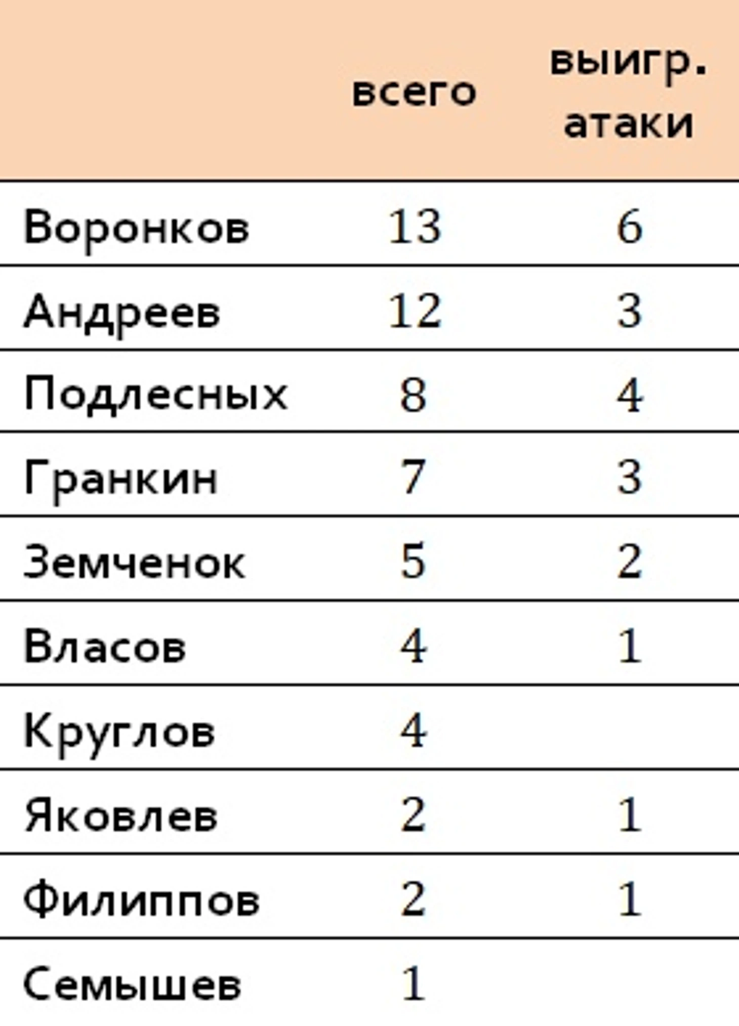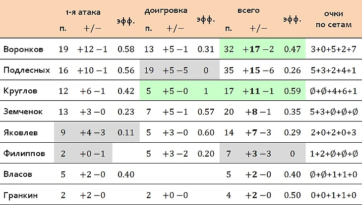 В первых двух партиях много атаковали Земченок и Подлесных (в 1-м сете у Подлесных 14 атак, у Земченка 13, во 2-м - у Подлесных 8, у Земченка 7), и их общая эффективность была не выдающейся, но и не катастрофической. Проигрывали атаки в основном не они, а первые темпы: точнее говоря, в первой и отдельно во второй партиях у пары Яковлев – Филиппов столько же проигранных атак, сколько у пары Подлесных – Земченок, но атаковали центры в три раза меньше (опять же в каждой из этих партий — а значит, и суммарно). В третьем сете Гранкин переключил основной канал на Воронкова: Федя атаковал больше всех (7 раз) и очень успешно: +5–0. Вообще Гранкин любит Воронкова (как нападающего) — на Кубке мира мы явственно увидели это. Почему он мало задействовал Федю в первых двух партиях — неизвестно. Возможно, что подключать Воронкова с задней линии не позволяла доводка, а когда тот был на передней, дядя Серёжа отвлекался на прокачку Земченка. В четвёртой (трудной) партии Федя забуксовал: он атаковал много, но малоэффективно: +2–1 из 9 попыток. Здесь основной силой выступил Круглов: +6–1 из 10. А в пятом сете Воронков установил выдающееся с формальной тоски зрения достижение: 7 очков в атаке (ещё одну атаку он не забил, и ни одной не проиграл). Семь очков в атаке - это сильно и для обычного сета, а уж для короткого смотрится очень круто. Но надо учитывать контекст: в этой партии не было борьбы и кровищи, она комфортно складывалась с самого начала, а канадская подача не мешала Гранкину делать что он хочет. Дядя Серёжа поступил просто и эффективно: раз Федя забивает, буду отдавать ему ещё и ещё. В итоге получилось, что Воронков набрал больше всех очков в атаке, но основной набор этих самых очков у него случился в лёгких сетах (хотя и в первой он атаковал неплохо: 3 из 5, но там ему было мало передач). Тем не менее рекорд есть рекорд (это я о семи очках за тай-брейк)! Скрытый герой нашей атаки — Круглов: он сделал основной вклад в выигрыш ключевой 4-й партии. А вот с первыми темпами у Гранкина всю игру не складывалось: только в 5-й партии в санаторно-курортных условиях (как странно всё-таки говорить такое о тай-брейке — но так оно и было) дядя Серёга дал три атаки Яковлеву, и тот все забил.