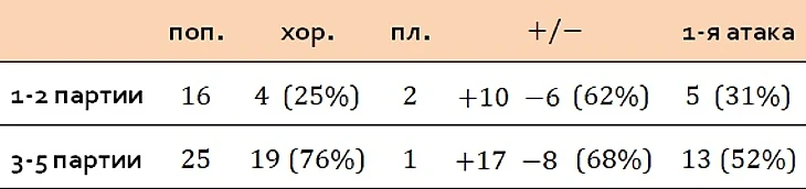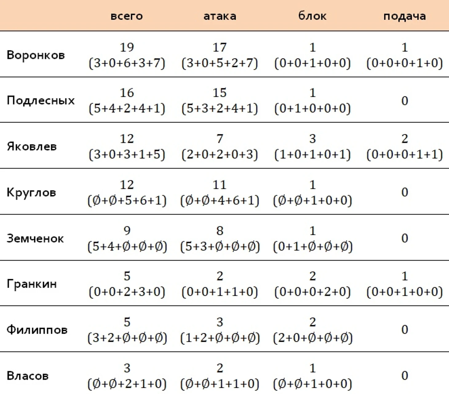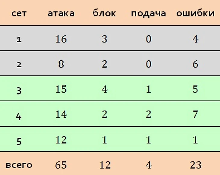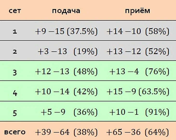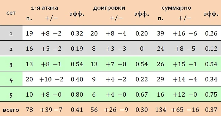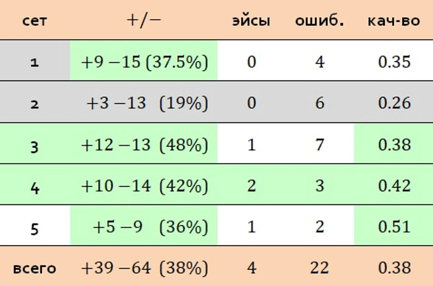 В первой партии уровень подачи был вполне рабочий, эту партию можно было брать. После радикального сбоя во втором сете удалось наладиться (причём через риск на подаче — на это указывают 7 ошибок).
