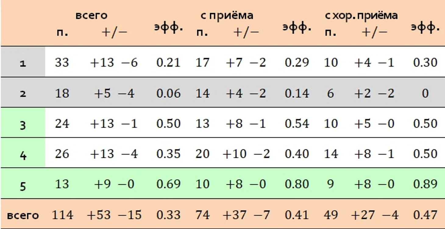 В пятой партии канадцы уже просто самоустранились и не мешали нашим играть: цифры хорошего приёма и реализации первой атаки у сборной России зашкаливающие. Это мы увидим ниже.
