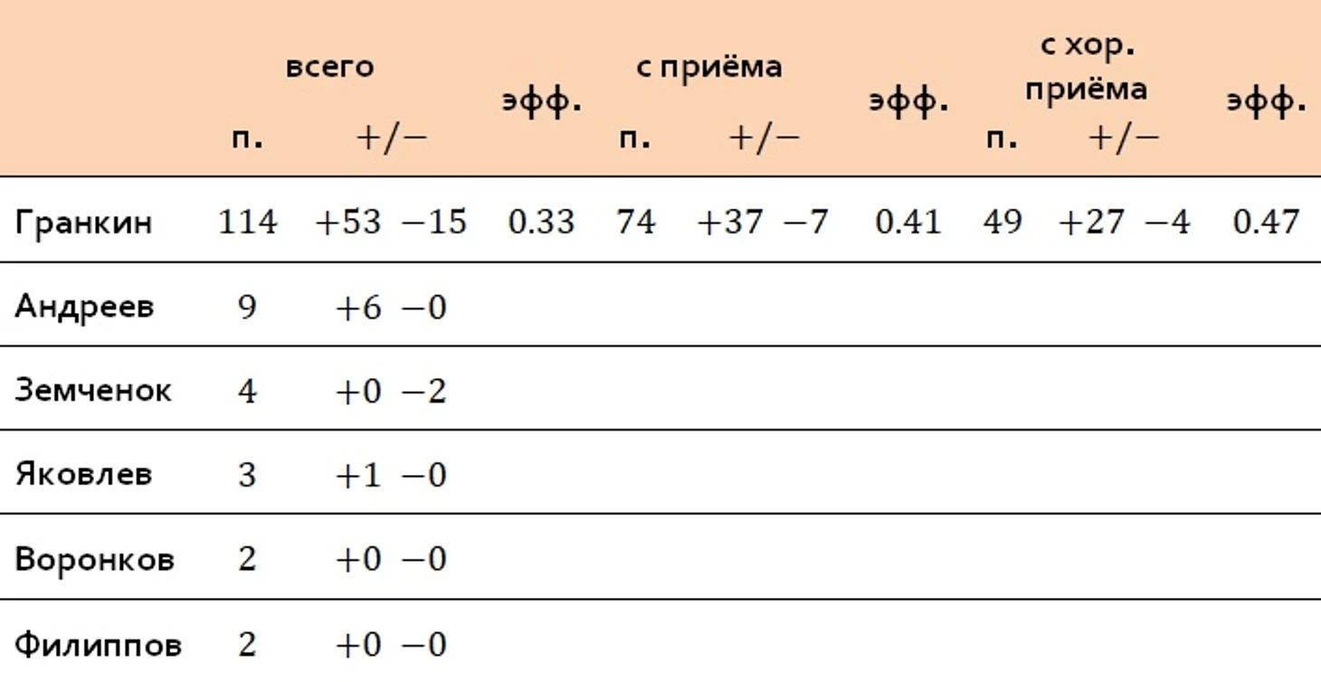 Эффективность атак с передач Андреева в этом матче составила 0.67. Он лучший пасующий. Ха-ха. Шутка.