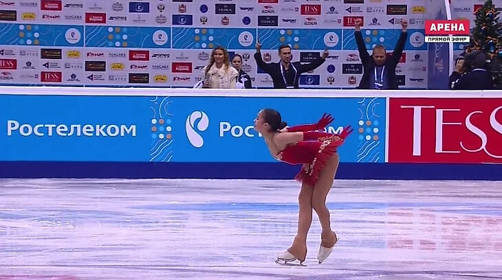 Загитова почти догнала Медведеву по технике (всего балл отставания) и расположилась на третьей позиции. Мария Сотскова – тогда еще стабильная фигуристка без проблем с допинг-контролем – занимала второе место.