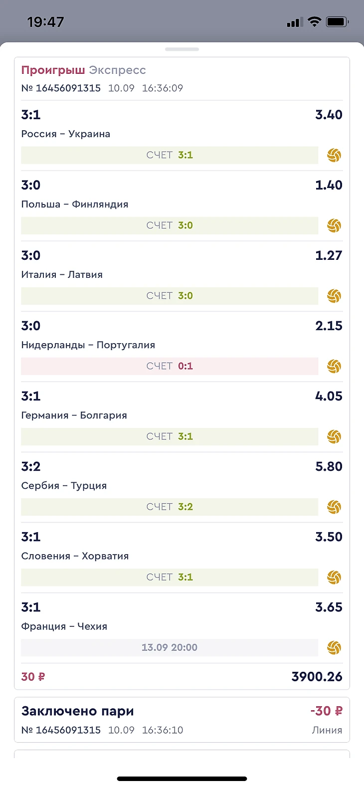 3. В общем, на этом скрине происходит следующее: когда определились все участники 1/8 финала мужского чемпионата Европы по волейболу (а это целых 8 матчей), я решила прокачать своё понимание этого вида. Но поскольку ставить на каждый матч в отдельности «это не спортивно», то я решила зарядить экспресс, да не просто на победителей, а на точный счет каждого матча. Денег поставила символических - две ставки по 30 рублей, но что такое коэффициент 3900? Это когда ты ставишь 30 рублей, а выигрываешь 117 000. То есть сродни выигрышу в лотерею, а с точки зрения вероятности так наверное и ещё более малореально.