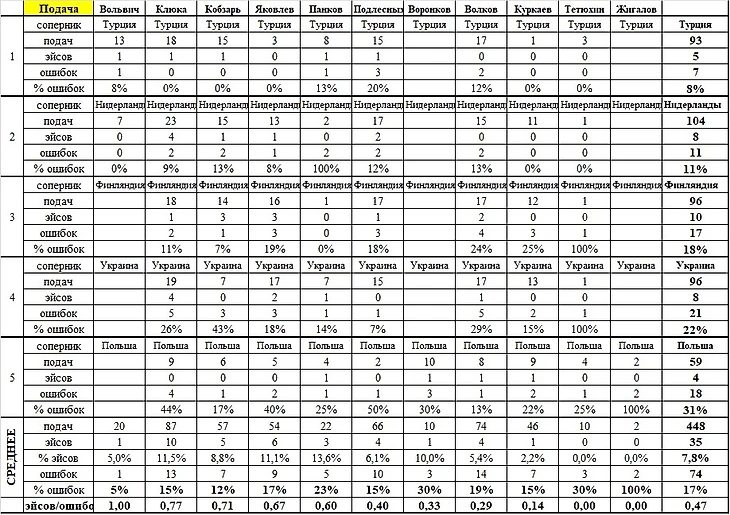 Но в целом подачу на уровне команды в целом можно занести в актив сборной России. А вот если посмотреть статистику индивидуально по игрокам, то картина не так радужна.
