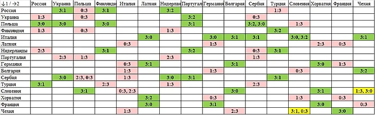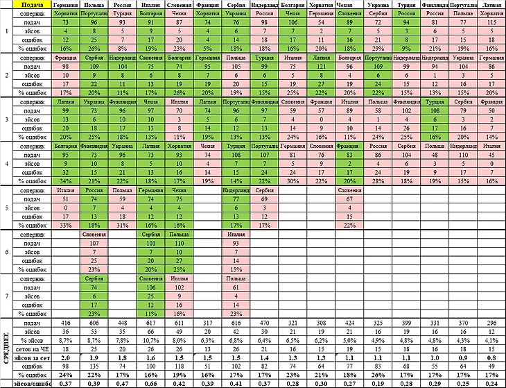 Сначала вводная таблица с результатами на этом чемпионате. Обратите внимание, что в расчеты я брала только матчи против команд, вышедших в плей-офф. Хотелось получить релевантную статистику, а не набранные десятками эйсы в играх с командами, слабо знакомыми с приемом. Да, некоторые аутсайдеры добрались и до плей-офф, проиграв абсолютно все матчи другим плейоффцам, но они попадают в статистику, так как вышли в 1/8. А вот матчи против Северной Македонии и Эстонии не попадают, при всех моих локальных симпатиях.