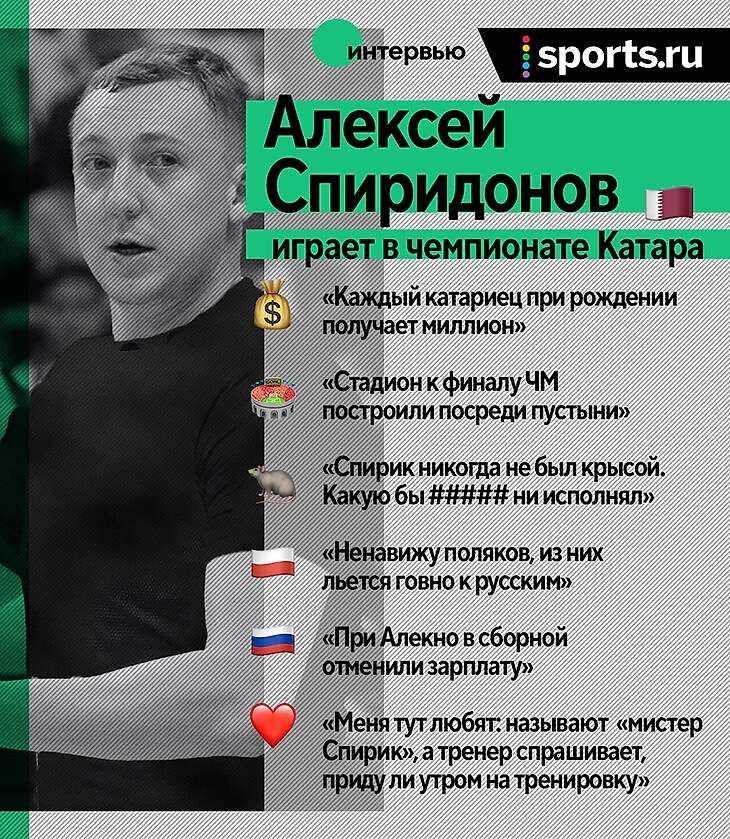 Говорить с ним – всегда весело. А сейчас еще и актуально. Скоро футбольный чемпионат мира, и вряд ли кто-то может рассказать про Катар вкуснее, чем Спиридонов. Он настолько освоился в Дохе, что позволяет себе пошлые шутки над арабами, но они уже не шарахаются, а от смеха валяются по полу вместе с ним. Это может означать только одно – Алексей стал своим и там.