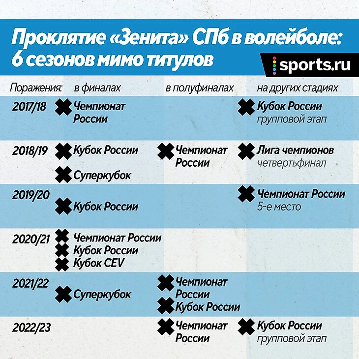 • Сезон-2020/21 вообще получился максимально обидным. «Зенит» прорвался в финалы сразу трех турниров (чемпионат России, Кубок России и Кубок CEV), но везде проиграл одному и тому же клубу – московскому «Динамо»: в декабре, марте и апреле. Так получается, что именно «Динамо» выставляет «Зениту» шлагбаум на пути к победам.