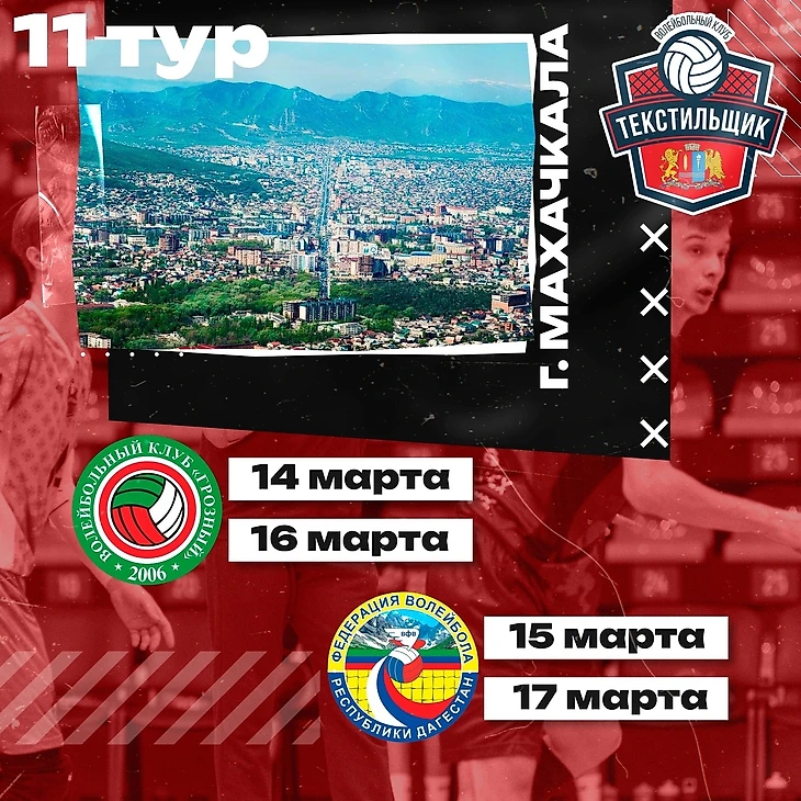 В четверг стартует 11 тур чемпионата Высшей лиги «Б». Ивановский «Текстильщик» проведет его в г. Каспийск респ. Дагестан. Соперниками волейболистов из Иваново станут команды из первой четверки: ВК «Грозный», игры с которым всегда яркие, напряженные и очень интересные ВК «Дагестан», который потерял очки лишь единожды за весь чемпионат, это случилось в Иванове, в том матче наши парни уступили в пятисетовом матче Параллельно с нами с этими же соперниками сыграет и ВК «Обнинск». Тур обещает быть очень интересным, будьте на связи, мы вам все расскажем и покажем!