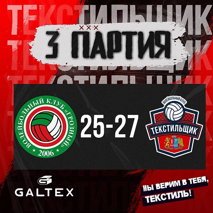 В третьей партии началась невообразимая битва.То «Грозный»,то «Текстильщик» вырывались вперед. Напряжение было при каждом розыгрыше. Отлично работал блок с обеих сторон. Итогом этого противостояния блоков стал равный счет 24-24 в самом конце. Победу же в третьей партии принес эйс капитана ивановцев Алексея Сколобанова.