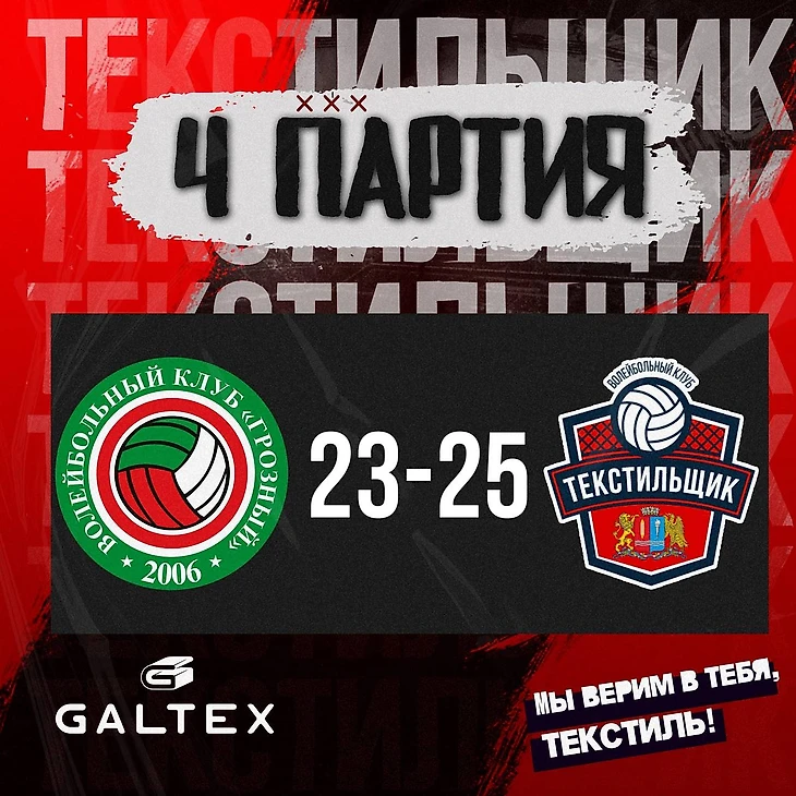 Четвертая партия продолжилась по сценарию третьей. Команды обменивались забранными очками,хотя порой розыгрыши были очень долгими и с обилием ошибок с обеих сторон. Счет 20-20 держал в напряжении,но в нужный момент «Текстильщик» сделал рывок и забрал партию. Сравняв счет по сетам 2-2. Все решалось в пятой партии,которая проходит до 15 очков.