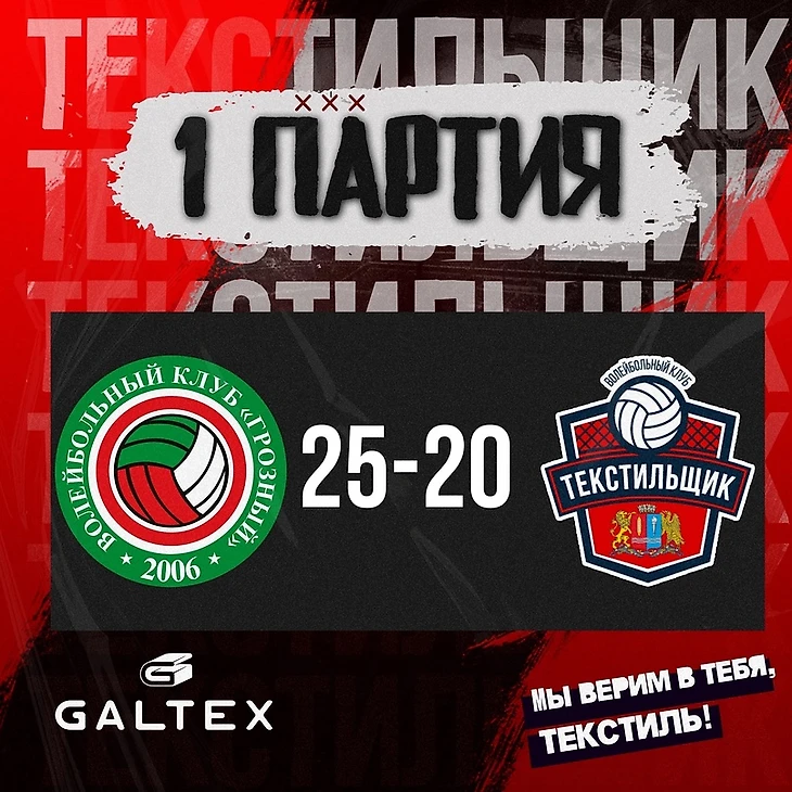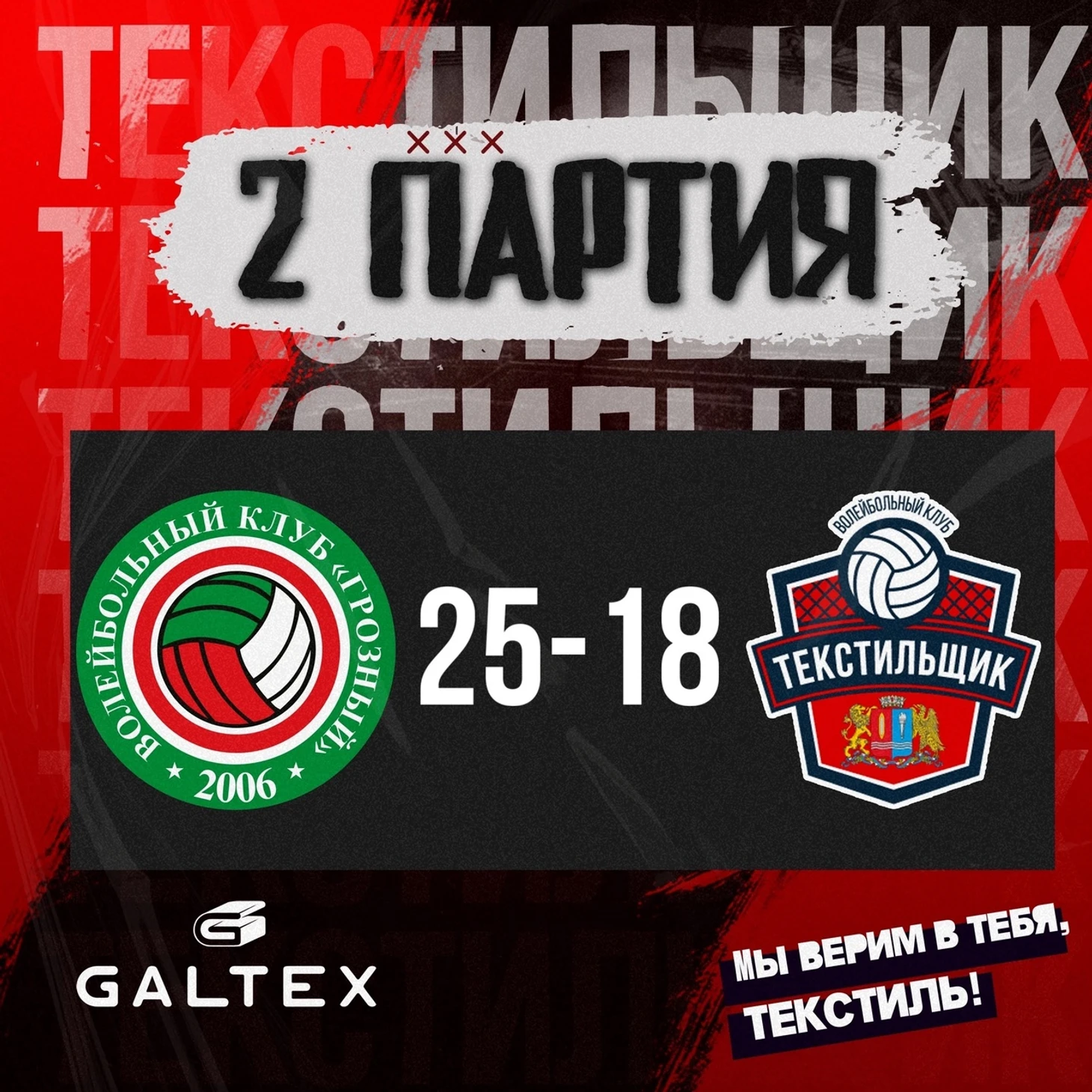 Первая партия началась с хорошего рывка ивановцев. Начали игроки «Текстильщика» уверенно и без нервов. Сначала клуб из Иваново вел 5-7,затем увеличил отрыв счет стал 7-12. Однако,после тайм-аута «Грозного» счет стал меняться в сторону соперников ивановцев. Под конец первой партии счет был 20-16, Текстильщик мог зацепиться,но увы уступил в первой партии.