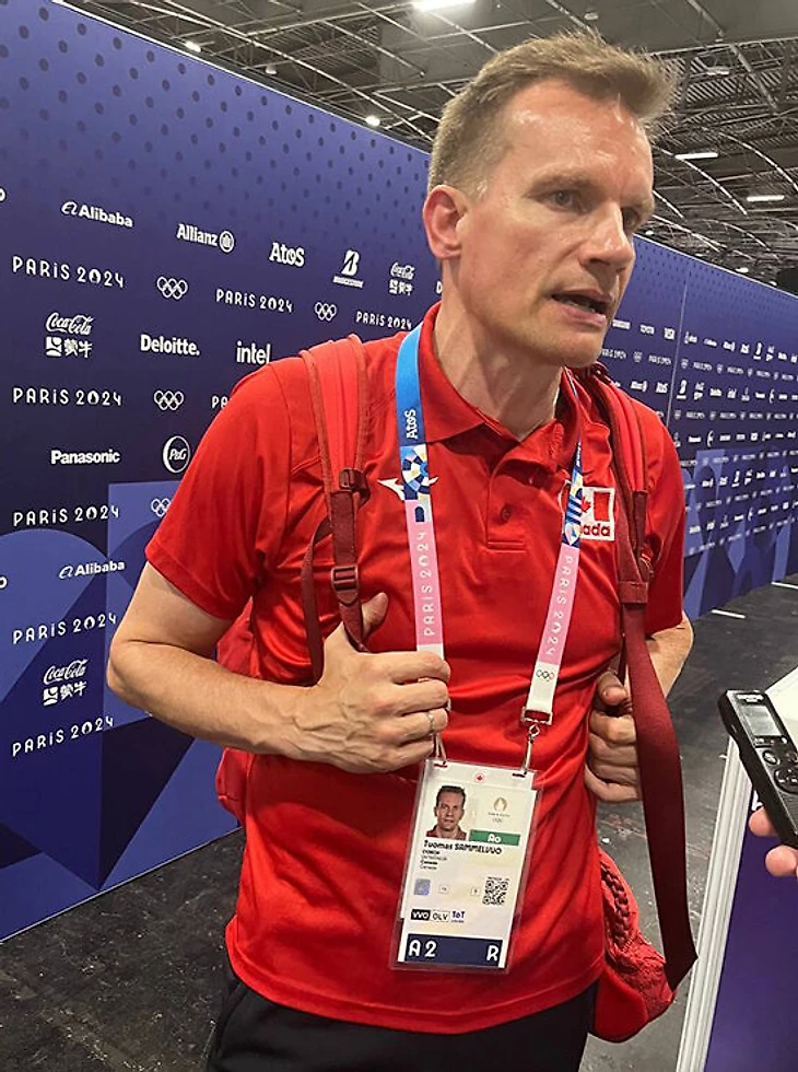 Тренер волейбольной сборной Канады Туомас Саммельвуо долго общался с финскими журналистами после матча.