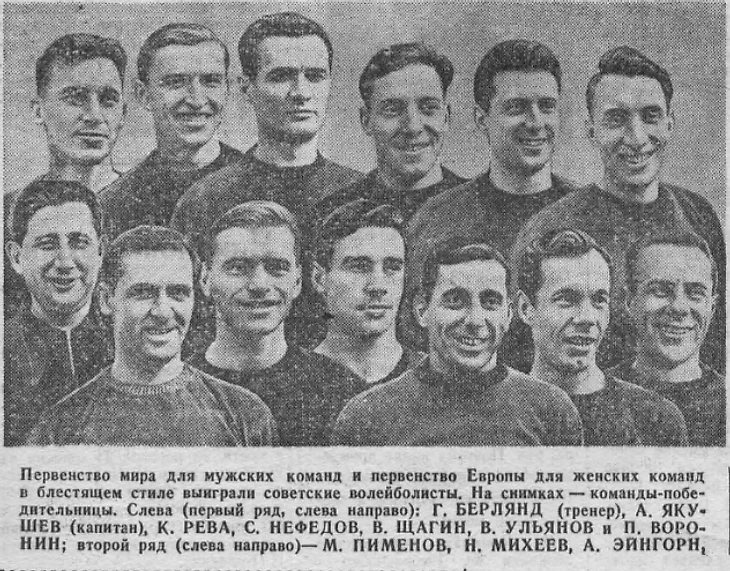 Сборная СССР по волейболу — чемпион мира. Стоят (слева направо): капитан сборной СССР Алексей Якушев («Динамо», Москва), Анатолий Эйнгорн (ДО, Ленинград), Валентин Китаев («Динамо», Москва), Сергей Нефедов («Локомотив», Москва), Владимир Ульянов (ДО, Ленинград), Владимир Щагин («Динамо», Москва), Порфирий Воронин (ЦДСА), Михаил Пименов («Спартак», Киев). Сидят: Владимир Саввин, Константин Рева (оба — ЦДСА), Владимир Васильченко («Динамо», Москва), Николай Михеев (ДО, Ленинград). Тренер (нет на фото) — Григорий Ефимович Берлянд.