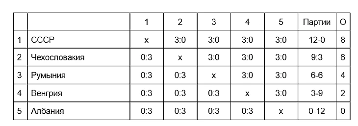 СССР — Албания — 3:0 (15:0, 15:1, 15:1).