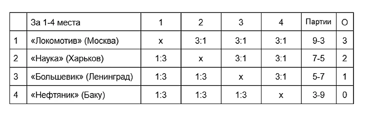 В финальной восьмерке сразу определился квартет лидеров — три сильнейших коллектива Москвы и команда ленинградского Дома офицеров выглядят сильнее своих соперников. Собственно, в поединках внутри этой четверки и случилось распределение призовых мест.