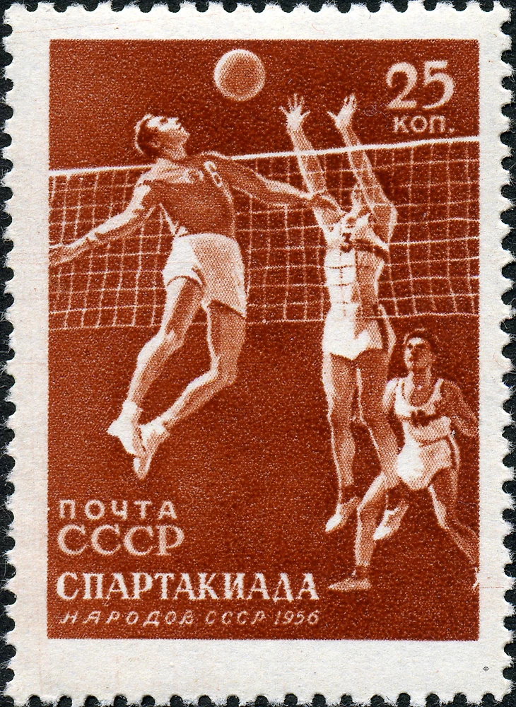 Почтовая марка СССР, посвященная I Спартакиаде народов СССР (1956). Художник Л. Голованов создал рисунок этой марки по фотографии А. Батанова, сделанной на матче СССР — Франция на чемпионате мира по волейболу 1952 года в Москве (опубликована в журнале «Физкультура и спорт», № 7 за 1953 г.), на которой на переднем плане запечатлен Константин Рева